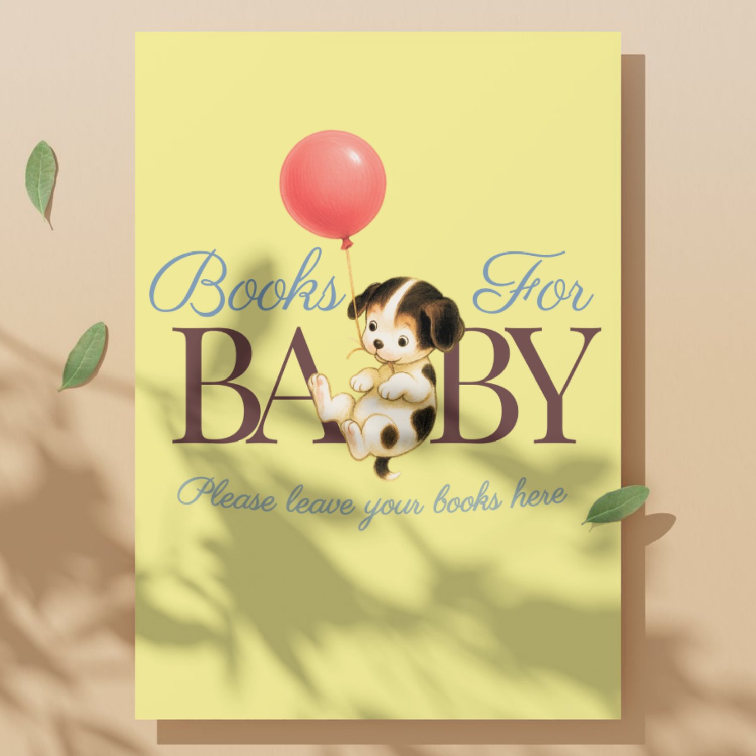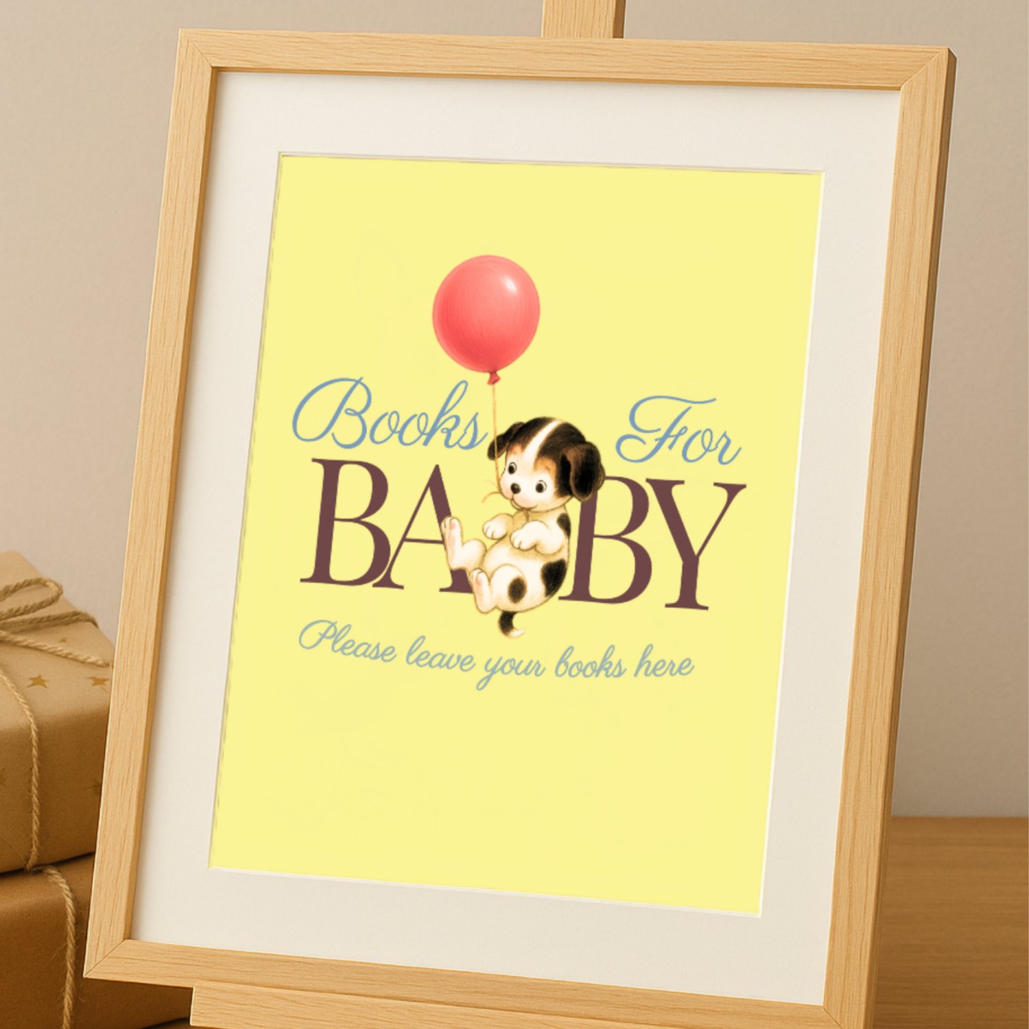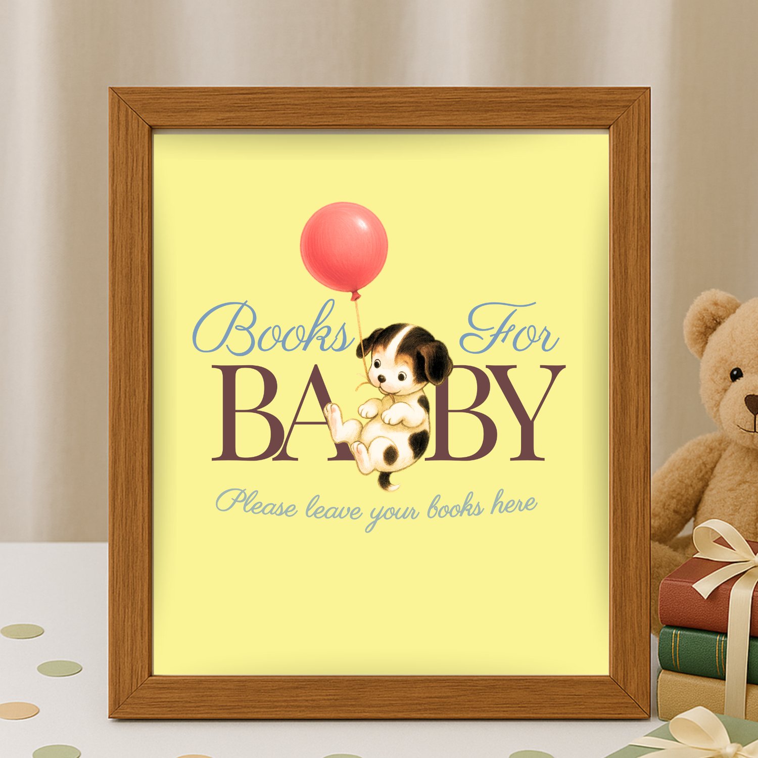 Add a nostalgic storybook touch to your baby shower with this vintage “Books for Baby” sign — featuring a sweet puppy holding a red balloon on a soft yellow background.