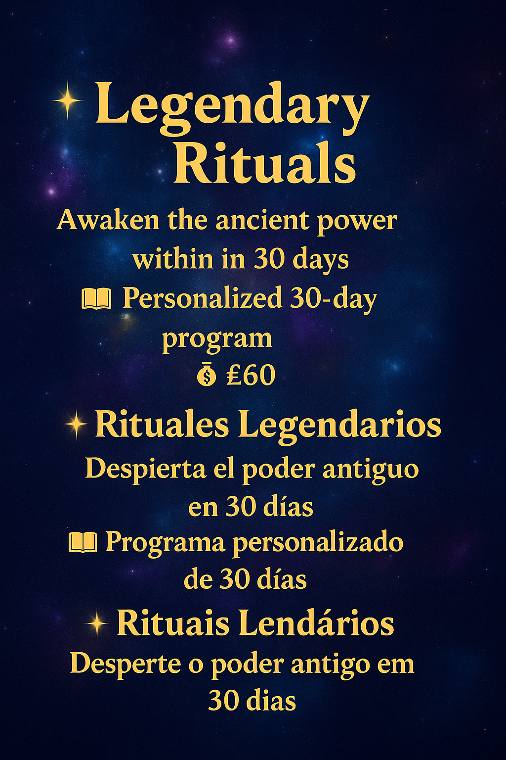✨ Awaken your legendary energy ✨ A unique 30-day ritual, created exclusively for your soul. ESPAÑOL ✨ Despierta tu energía legendaria ✨ Un ritual único de 30 días, creado exclusivamente para tu alma. PORTUGUÊS ✨ Desperte sua energia lendária ✨ Um ritual