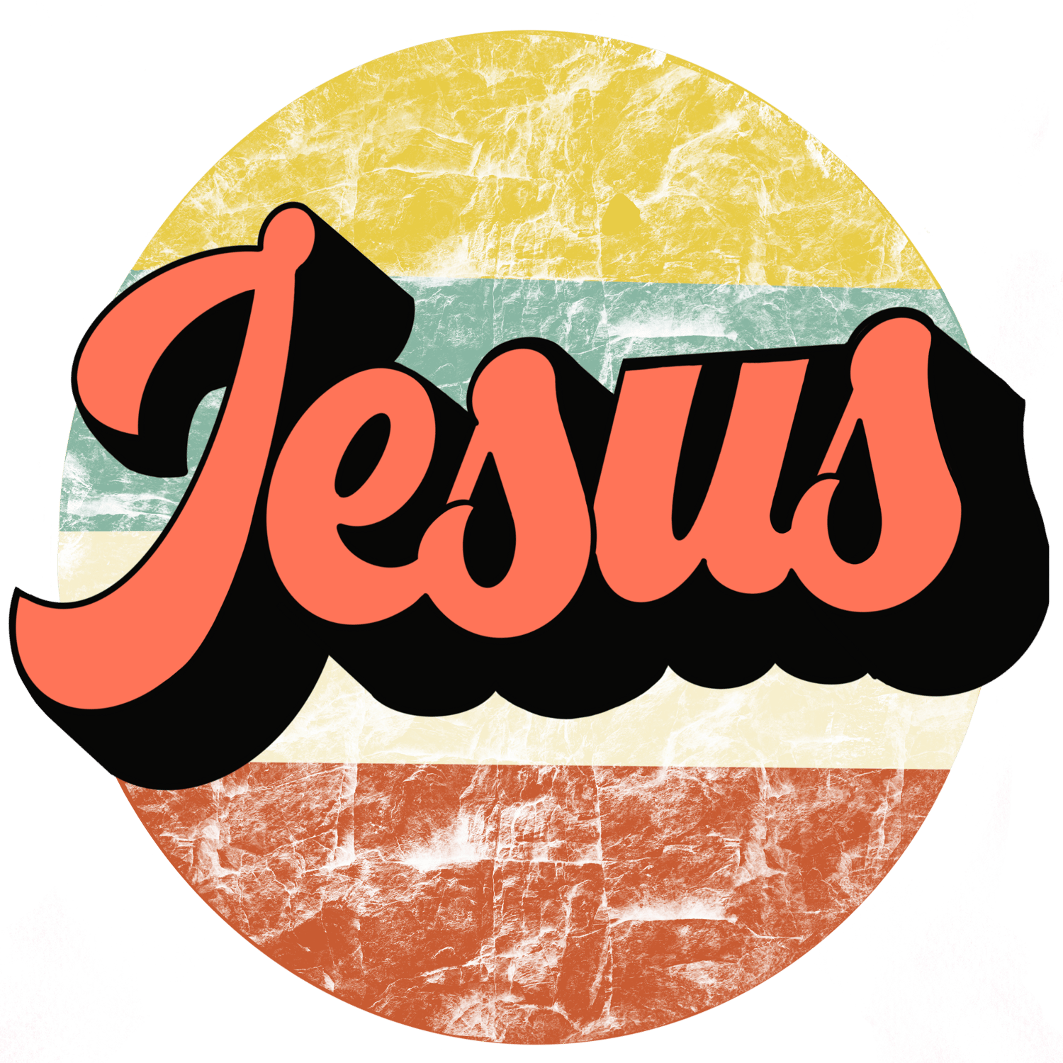 - Make a bold faith statement with this vintage-inspired “Jesus” PNG design. Featuring a distressed retro circle and bold lettering, this digital file blends 70s nostalgia with timeless truth — perfect for Christians who want to wear their faith loud and proud.