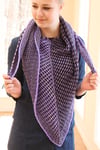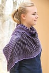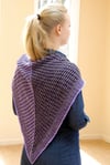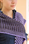 This graphic, topdown shawl begins with a garter tab, then is worked in narrow, two-color stripes with slipped stitches in reversed colors on each side of the central spine. The lower edging is a complementary slipped stitch rib which curves around the point and extends to each tip, emphasizing the strong linear elements of the shawl. Visually complicated but easy to work, only one color is used at a time, and the slipped stitches result in the pattern looking different on each half of the shawl. Increases on every row create a long v-shaped wingspan which accentuates the strong lines and showcases the changing optical interplay of colors.
