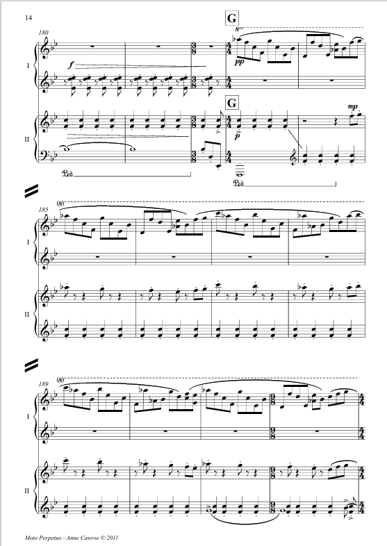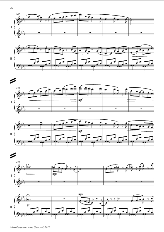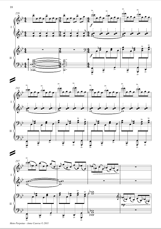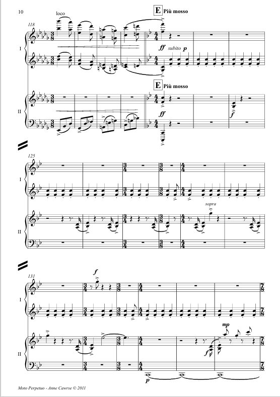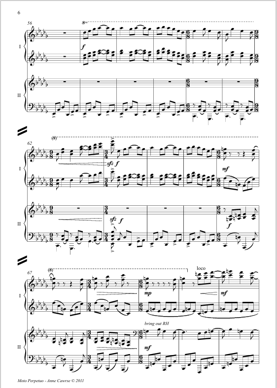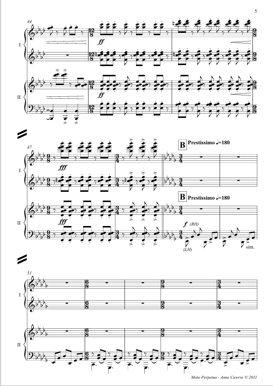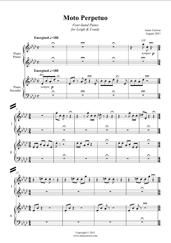 The prospect of composing my first four hand piano piece was both exciting and inspiring; the actuality of getting notes on paper and a score into Leigh and Coady's hands with fair rehearsal time was, for most of the process, a hard slog. Sadly for me, in its infancy the piece turned itself into a bit of a mad rampage of notes, requiring more effort, thought and 'cooking time' for both myself and the performers. The frenetic pace and boisterous gestures which envelop most of the work did not agree with my young sons’ nap time, and hence it was with great relief I managed to pull together approximately 9 minutes of music, conveniently shaped into Rondo form, which I hope is entertaining for performers and audience alike.