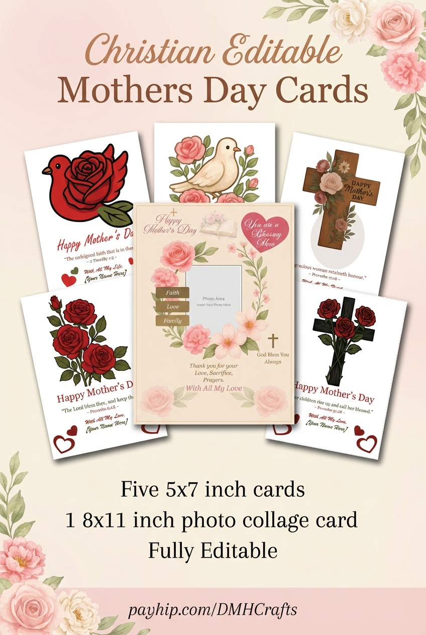 Celebrate Mom with a beautiful set of Christian Editable Mother’s Day Cards designed with soft watercolor florals, Bible verses (KJV), and elegant faith-inspired artwork. Perfect for gifting, church handouts, small business resale (as printed cards), or personal use.