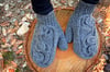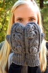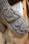 These mittens are worked tip down starting with a provisionally cast on rectangle. The vine is a cable stitch, with ring cable branches. You can chose from three leaves for the foliage.