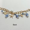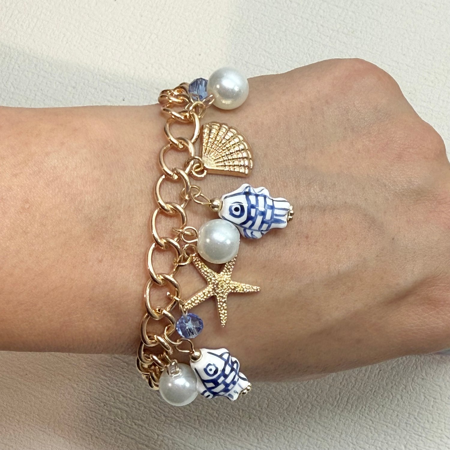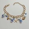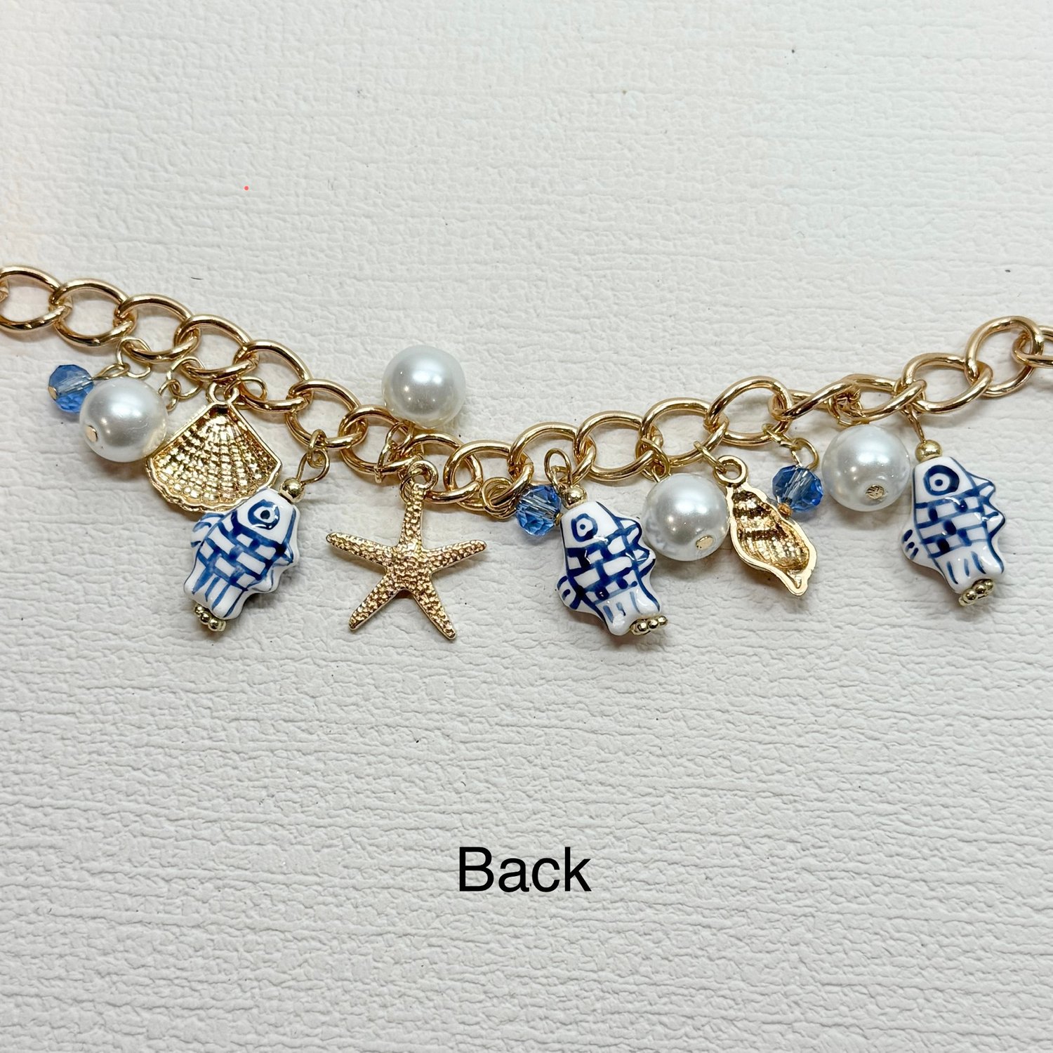 Ocean themed gold tone charm bracelet with extender. Ceramic fish, faux pearls, blue glass faceted beads and gold tone metal shells and starfish.