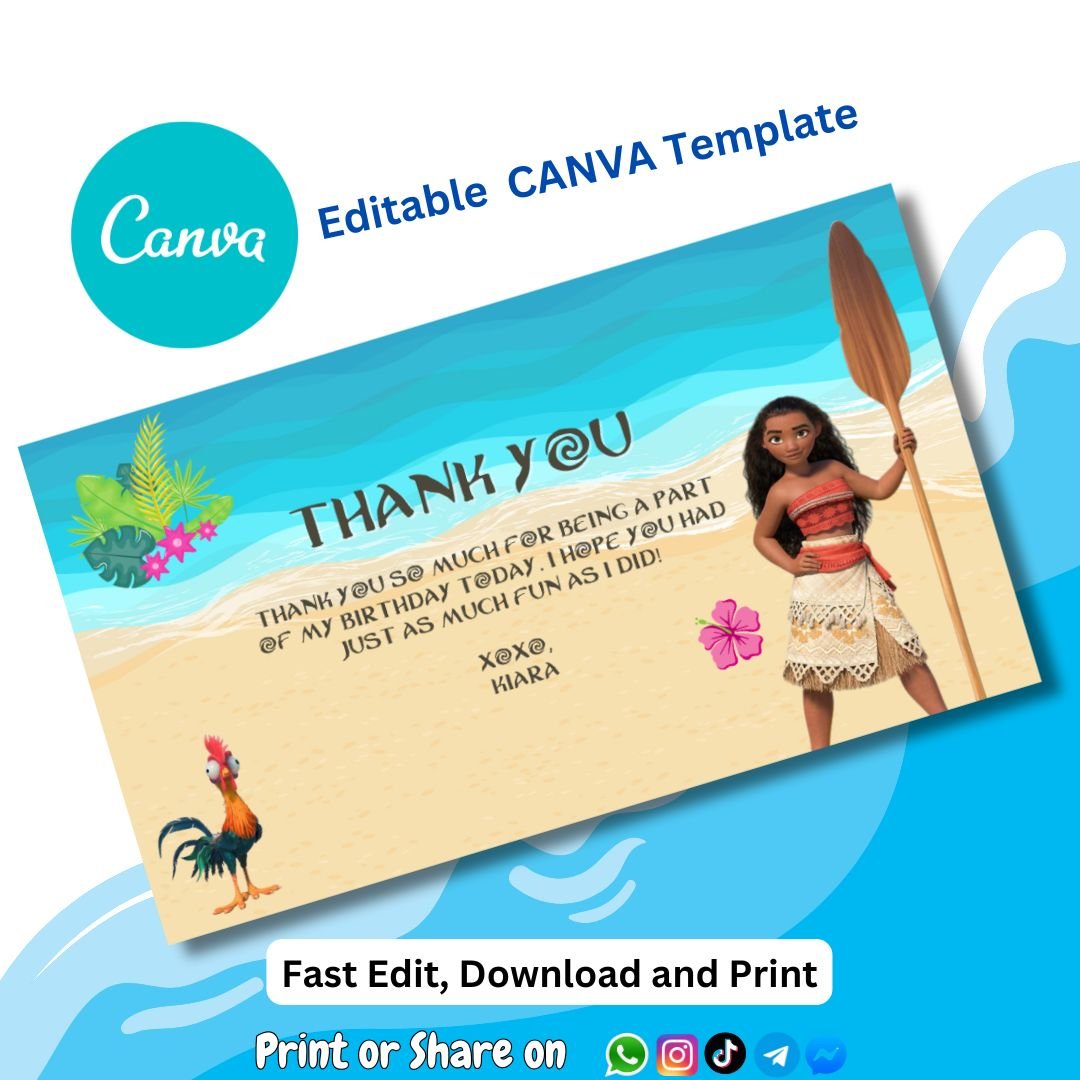 Dive into the adventure with our editable Moana 2 digital cards, perfect for a Moana-themed birthday invitation or a movie night invite! Featuring vibrant designs inspired by the new Moana 2 movie, these cards can be easily customized and sent digitally or printed for a personal touch. Make your celebration unforgettable with the spirit of Moana and Maui !
