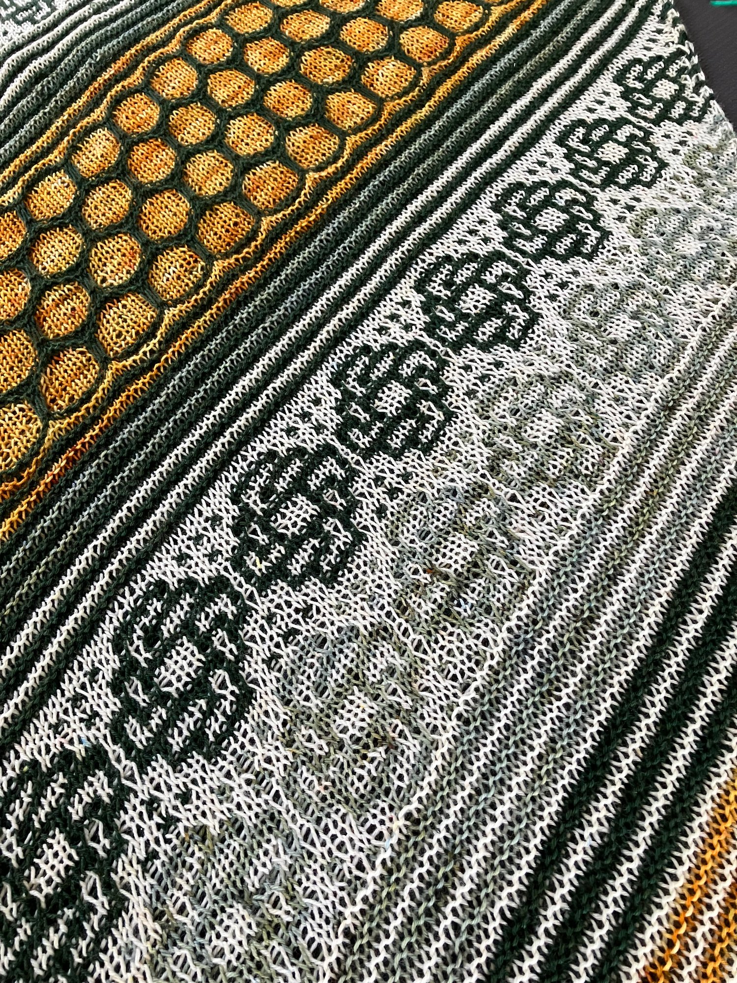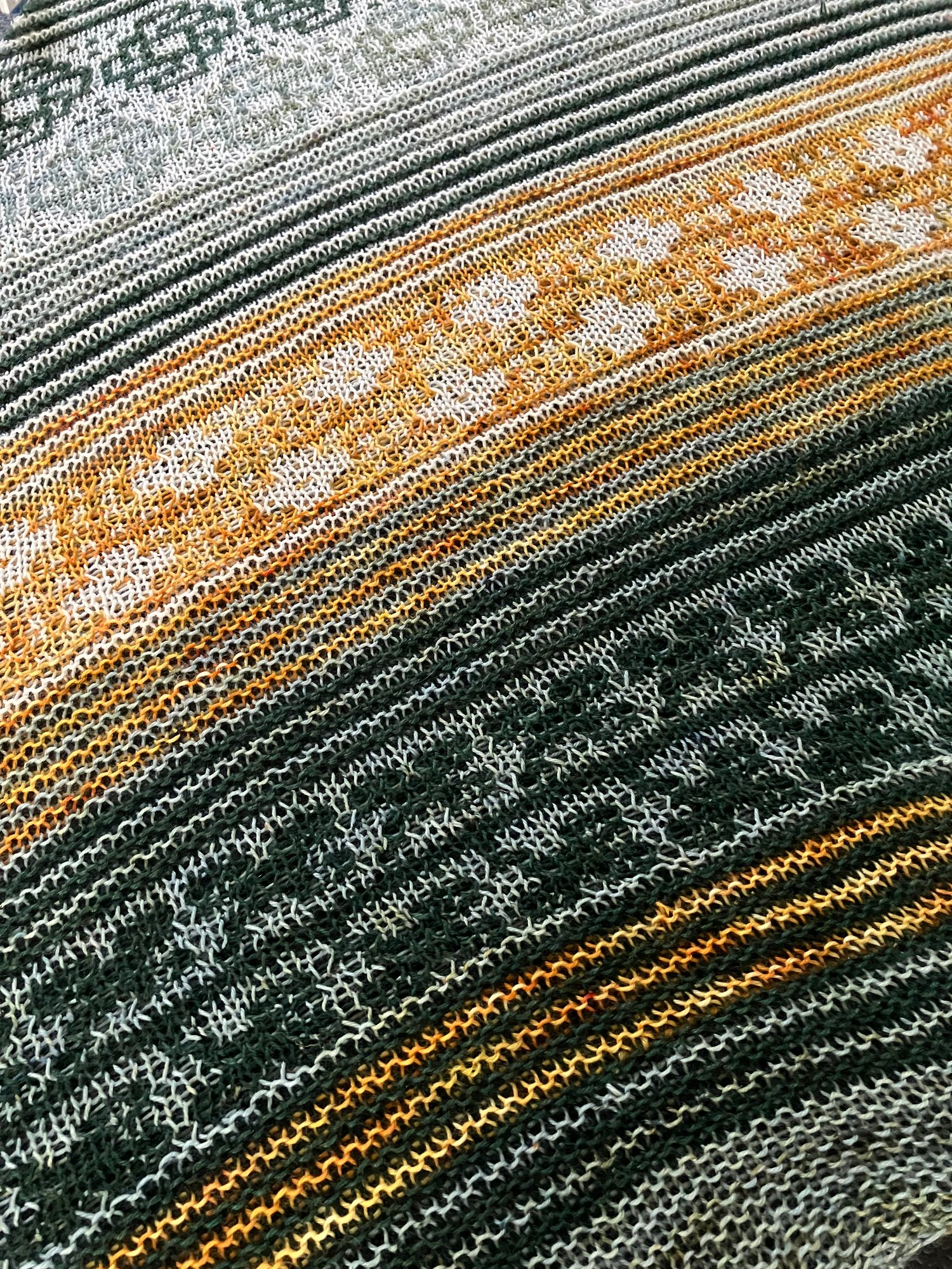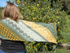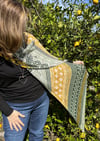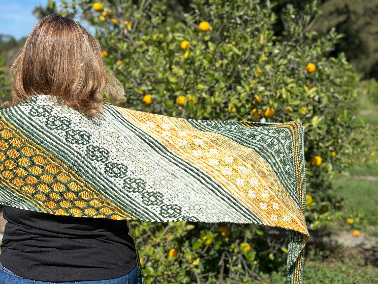 The Sweet Scent of Orange Blossoms is a rectangular wrap knitted on the bias, which means that it is increased and decreased by one stitch every right side row. There are large sections of garter stitch stripes, with slipped stitch and mosaic stitch patterns to keep it interesting. An adventurous beginner will find the slipped stitches easy to memorize, but will keep seasoned knitters interested.