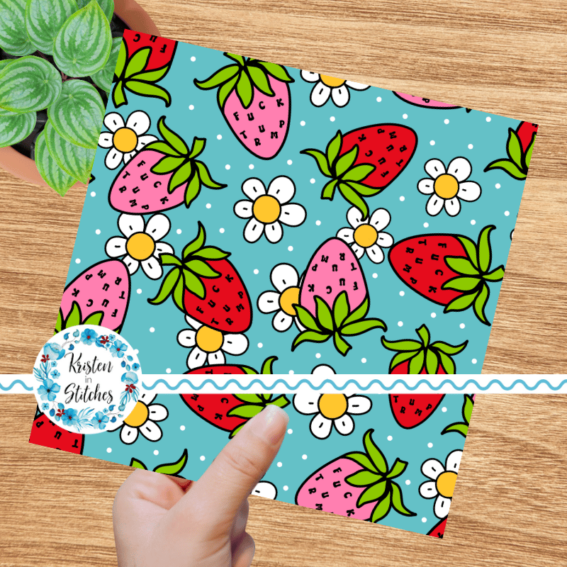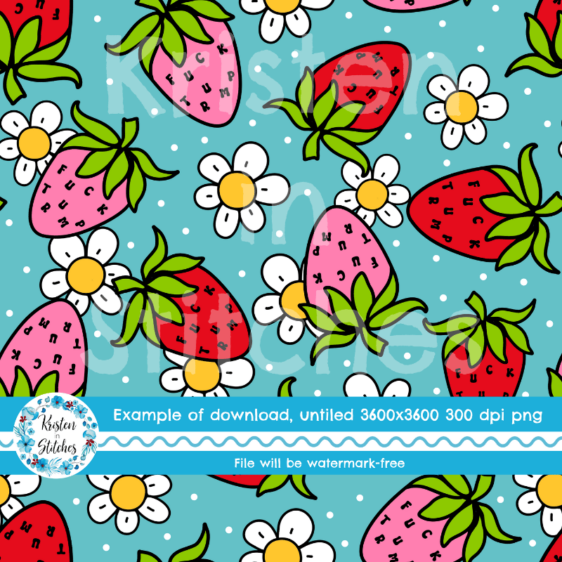 A sweary Fuck Trump strawberry patch with daisy flowers on blue.