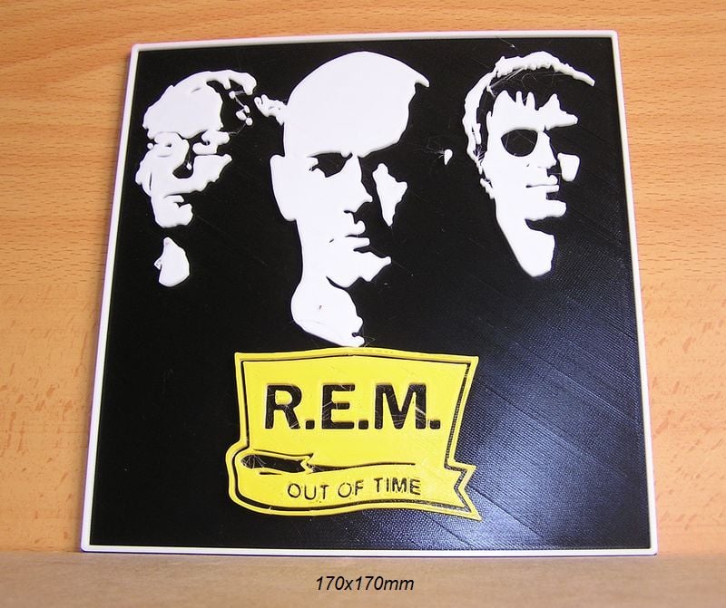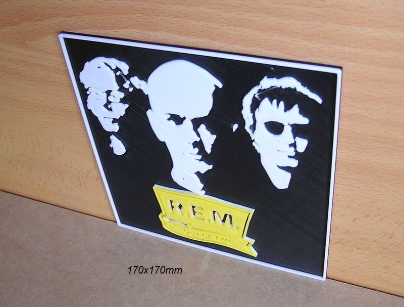 R.E.M. Poster with logo of a music group and singers, these STL and Gcode files have been created to be printed in various colors with any FDM type printer. The color changes have been made with the Elegoo Neptune 3 Pro printer, but they can be printed on any printer.