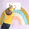 Retro Rainbow is a bold rainbow pattern featuring beginner friendly curved piecing. The rainbow block finishes at 42" x 25", making the curves extra large and perfect for first time curve quilters. The Retro Rainbow pattern makes a four arc rainbow in a baby size quilt that finishes at 42" x 52".