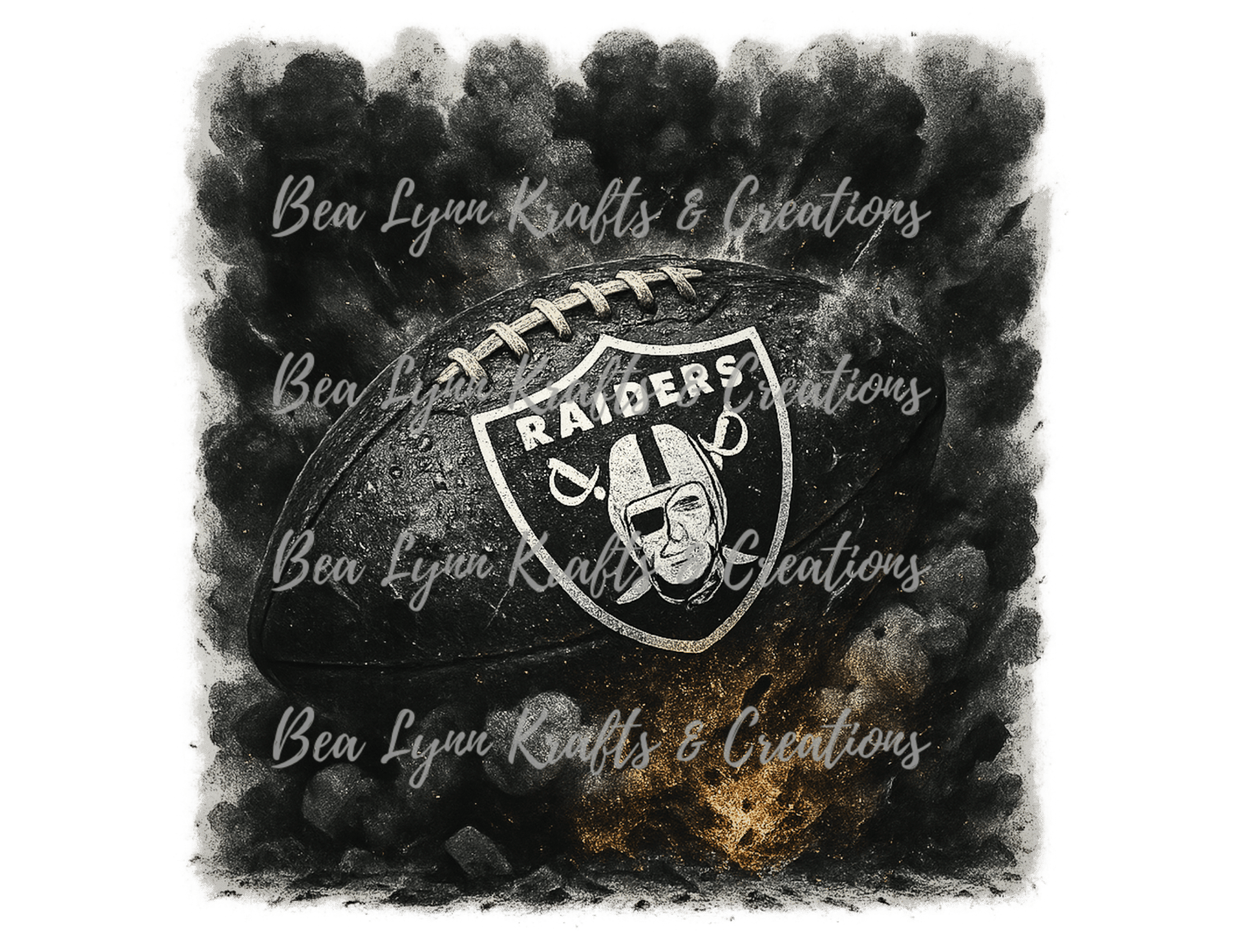 RAIDER NATION, RISE UP! This Las Vegas Raiders football splash PNG is a storm of blacked-out grit and silver vengeance. A war-torn football—splattered with water droplets and stamped with the iconic Raiders logo—bursts through an inferno of black flames, jagged silver smoke, and cracked-earth effects. Pirate energy pulses through the design, with crossed swords hidden in the mist and ember trails tearing across the field. It’s bold. It’s dangerous. It’s built to dominate your POD listings and merch game like a fourth-quarter comeback in Sin City.