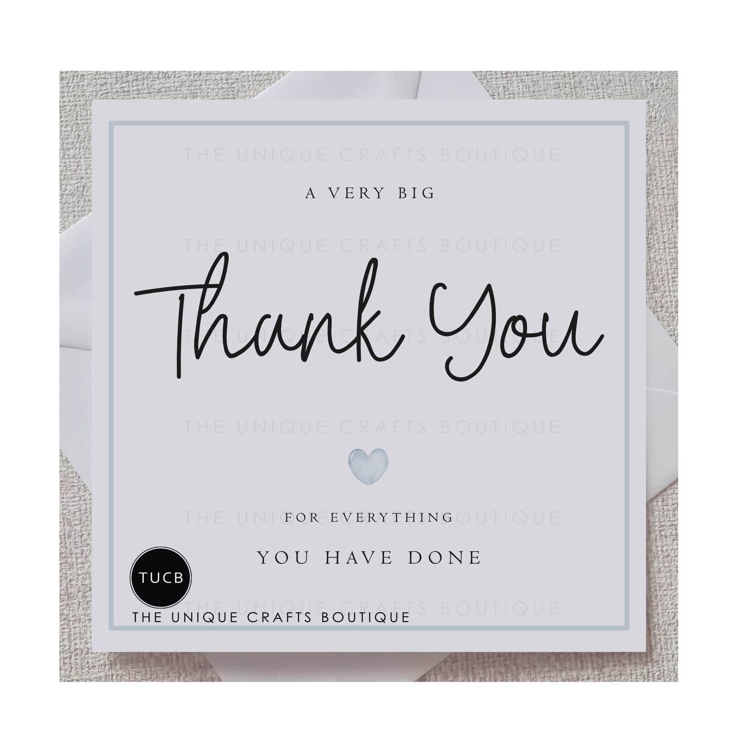 Printed with the simple yet meaningful message 'a very big Thank you for everything you have done' written in Black with a Blue watercolour effect heart and border.
