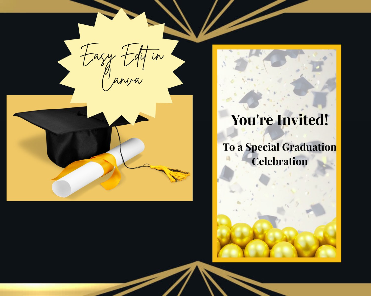 - Custom text: Graduate's name, school, date, time, venue, RSVP details