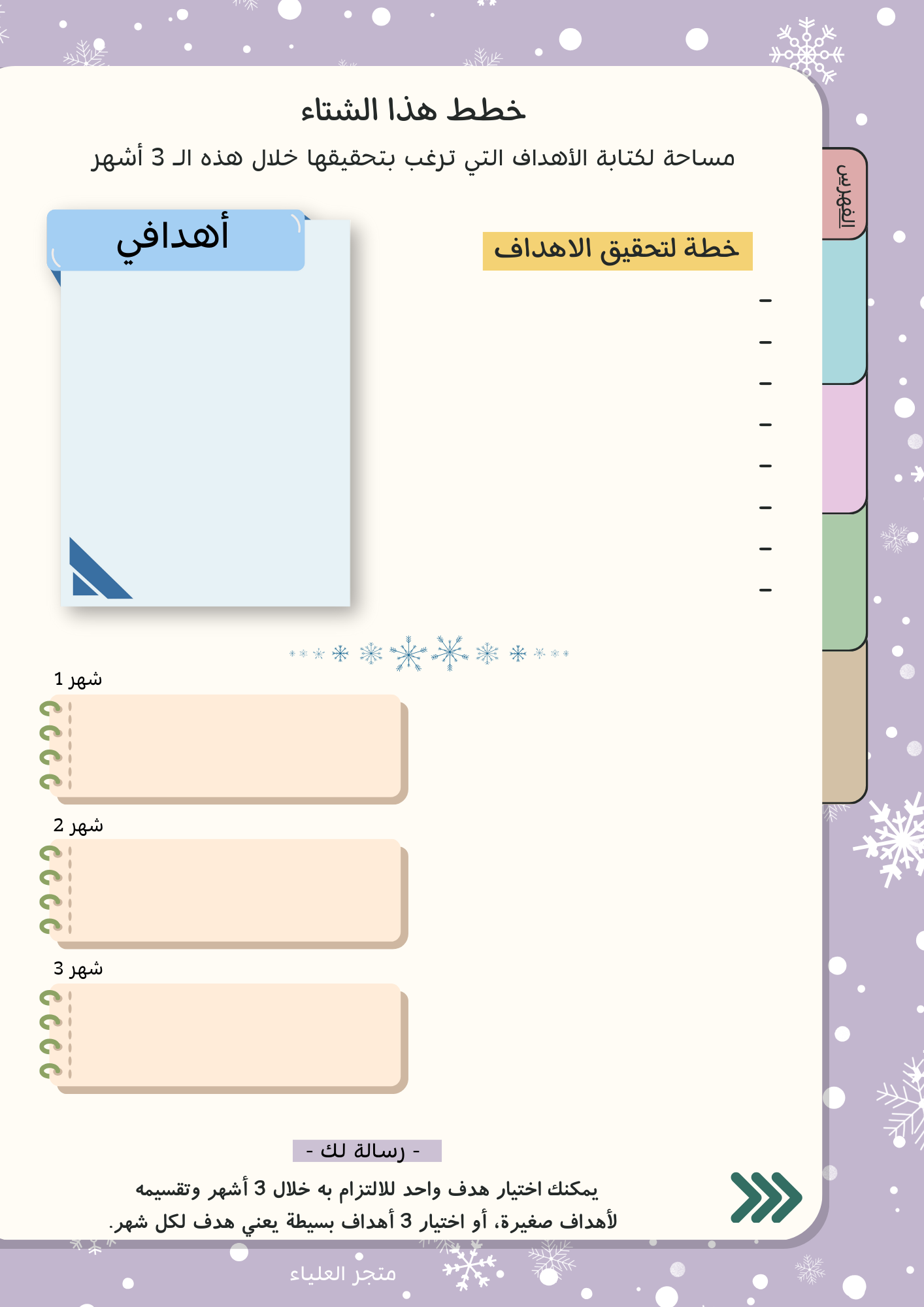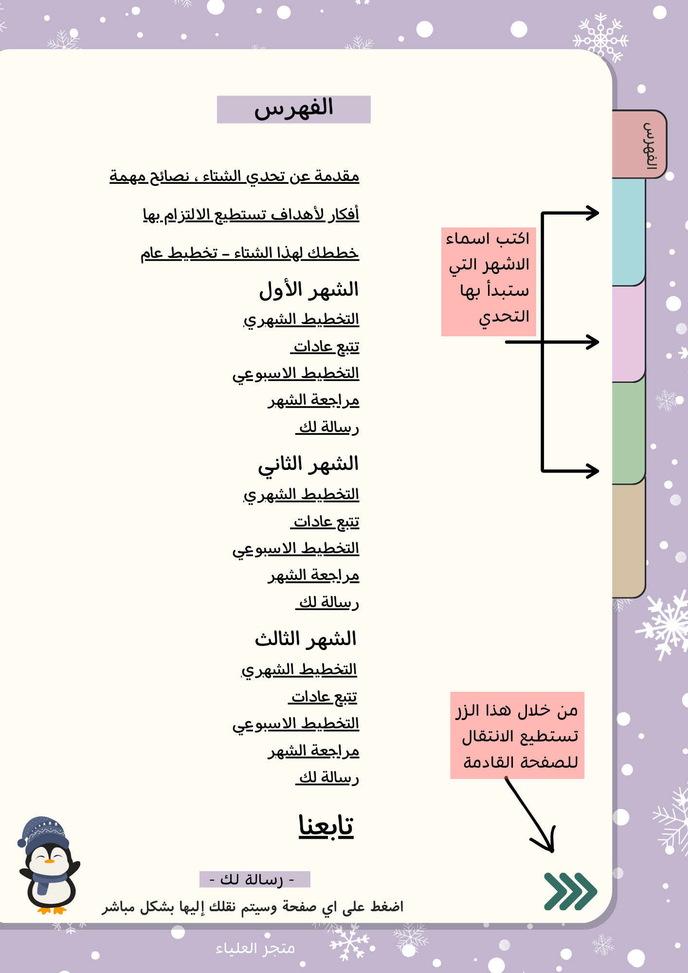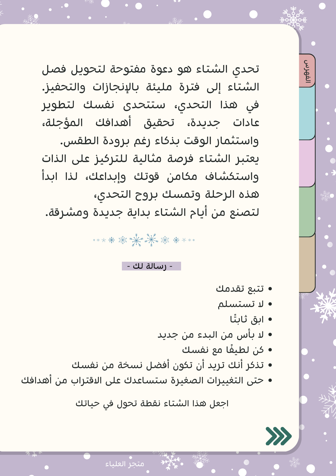 تحدي الشتاء للنجاح هو ملف تفاعلي صُمم خصيصًا لمساعدتك على استغلال فصل الشتاء بأفضل شكل ممكن وتحقيق أهدافك.
