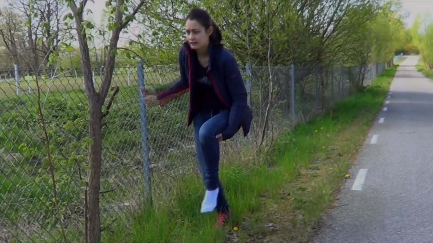 Elisabeth is late and has to run to the bus station when she suddenly sprained her ankle.She had to take her shoe off because of the pain in her ankle and starts jumping instead on one leg.She stops every now and then to touch her leg to endure some pain and catch her breath.After a long way of jumping she finally reach a bench and sits down to massage both of her injured foot but also her other foot that now is tired after all hopping.