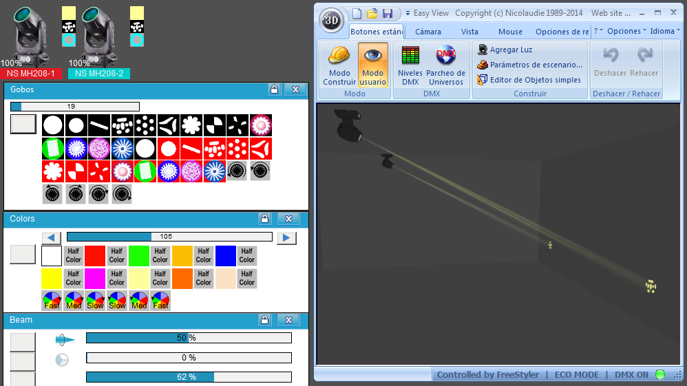 - Esta librería NO reemplaza al Fixture de Freestyler o QLC+, sólo es para ver la representación 3D. Es decir, HAY QUE TENER YA EL FIXTURE DE FREESTYLER o de QLC+ para controlar el equipo real.
