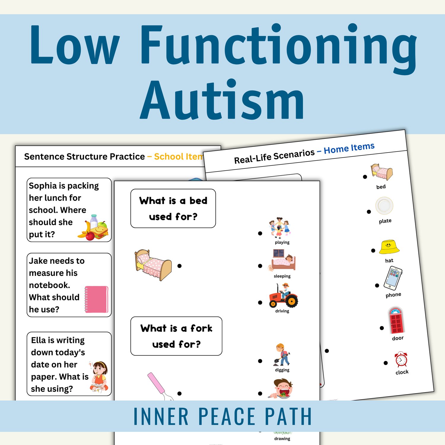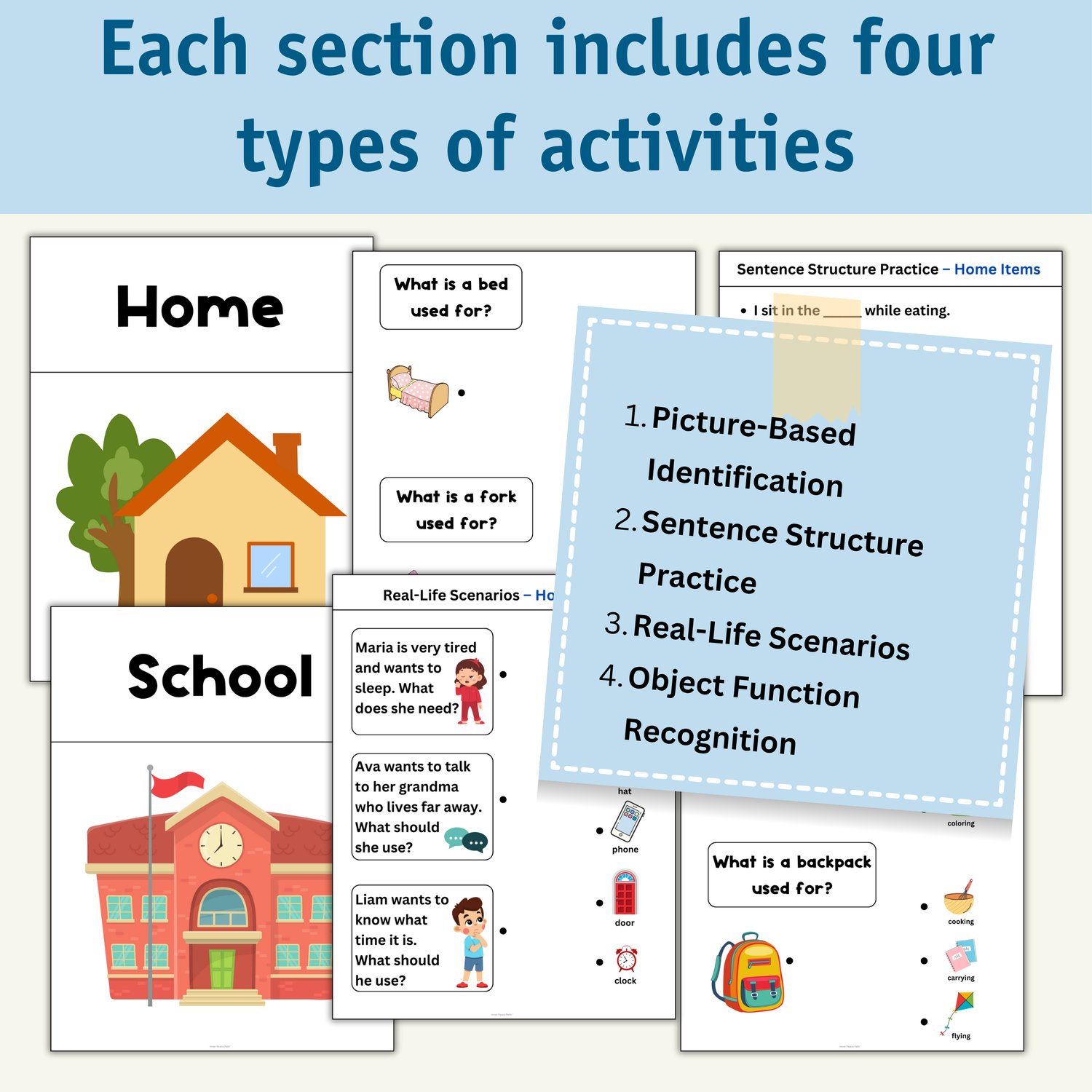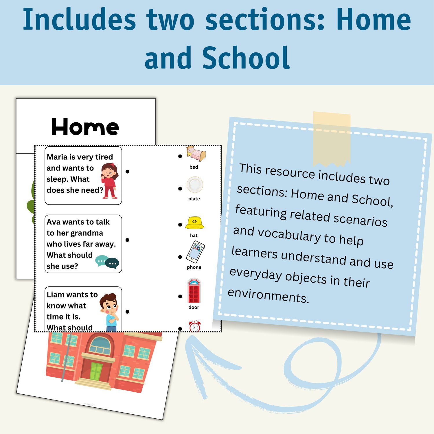 This set of activities helps learners with low-functioning autism understand everyday objects and their uses. It includes two sections: Home and School, with related vocabulary and real-life scenarios.