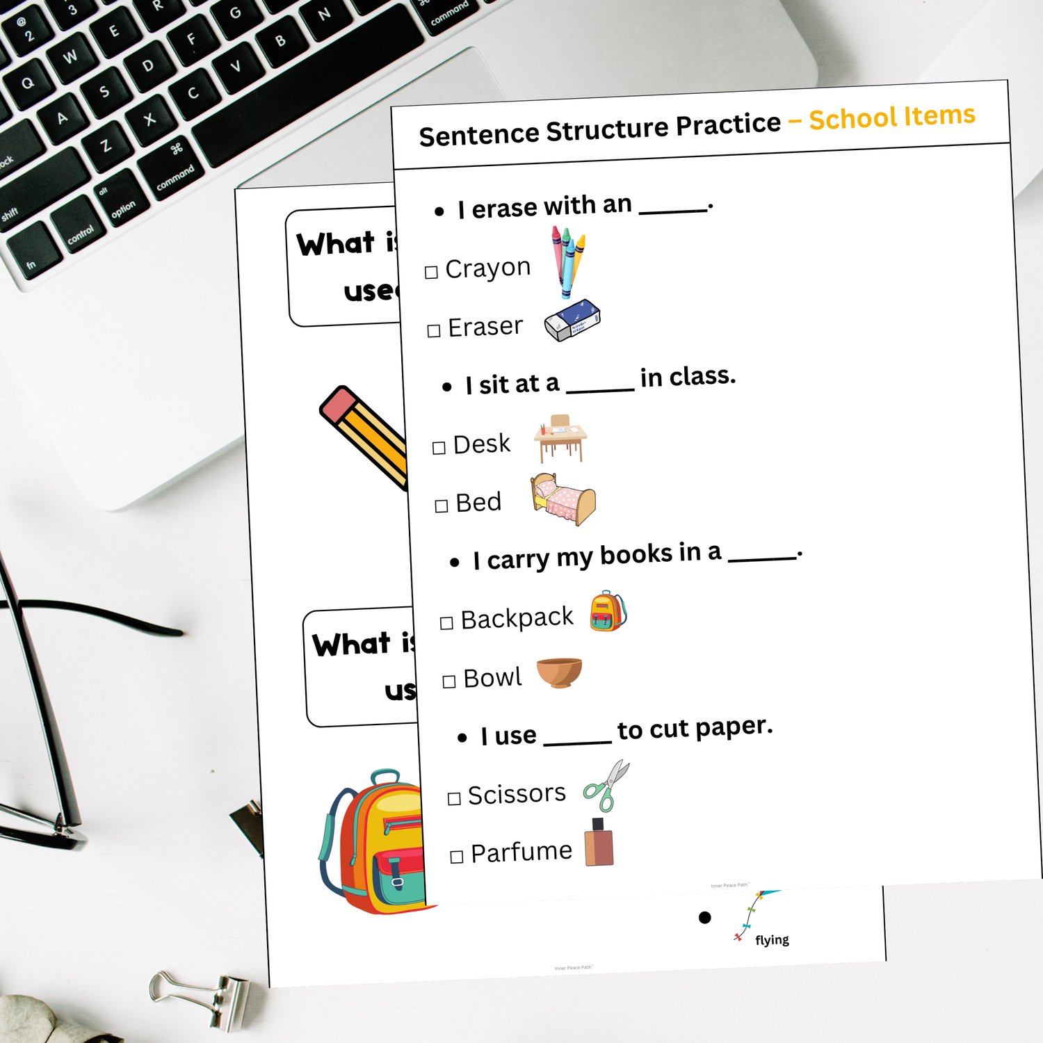 - Picture-Based Questions – Students choose the correct use of an object.