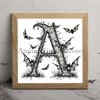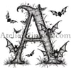The letter A coloring book halloween occupying 90% of a 1024x1024 image. Use an Old English font style with clear outlines resembling a coloring book page. The character is composed of intricate bat silhouettes, creating a spooky Halloween atmosphere. Use only pure black (#000000) for the character and outlines, and white for the background.2D, black and white style resembling a high-quality adult coloring book page.