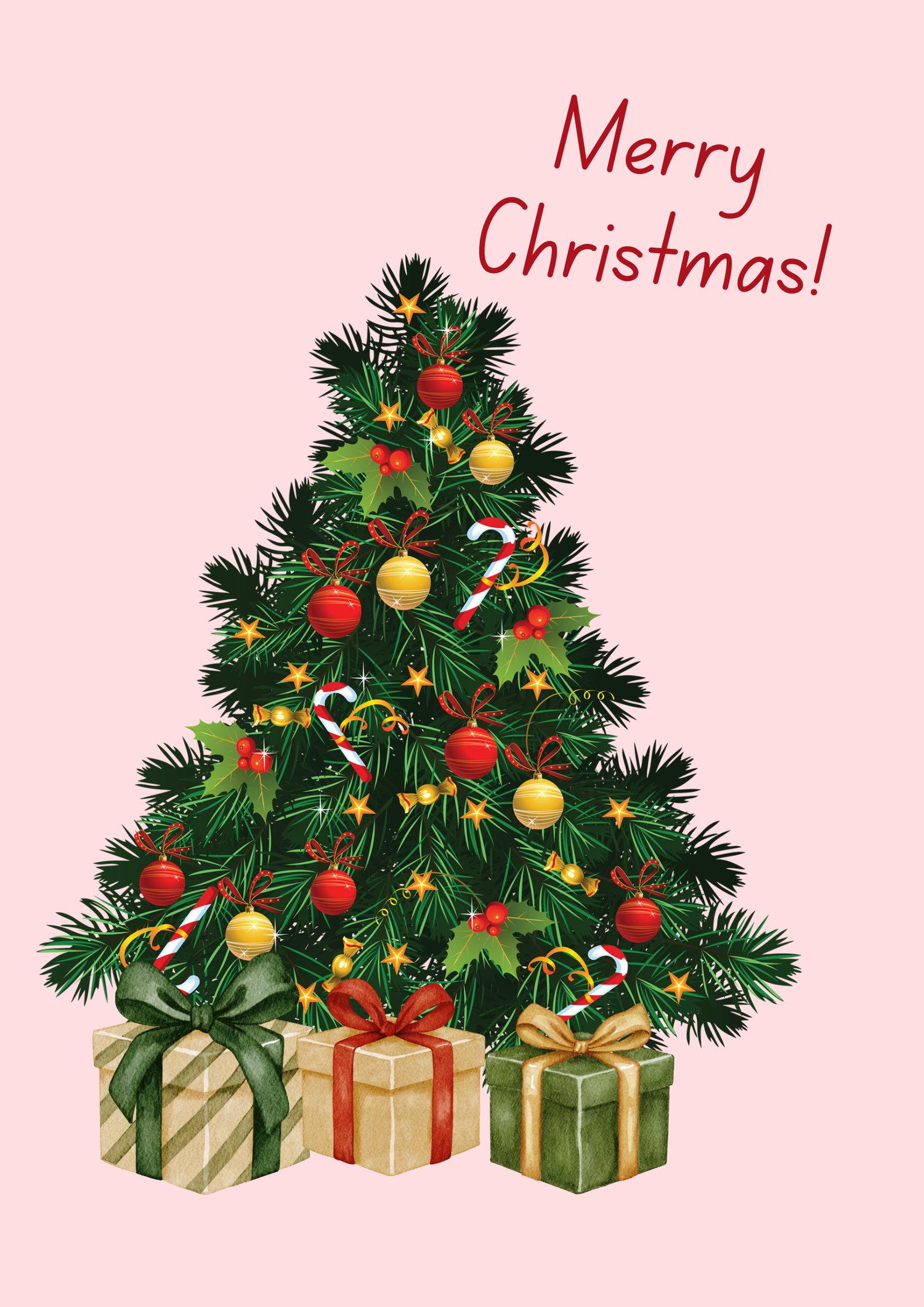 This beautifully designed digital print features a classic Christmas tree decorated with ornaments, candy canes, and presents — the perfect way to bring warmth and cheer to your home during the holiday season. Ideal for printing, framing, or using digitally to spread Christmas spirit!