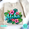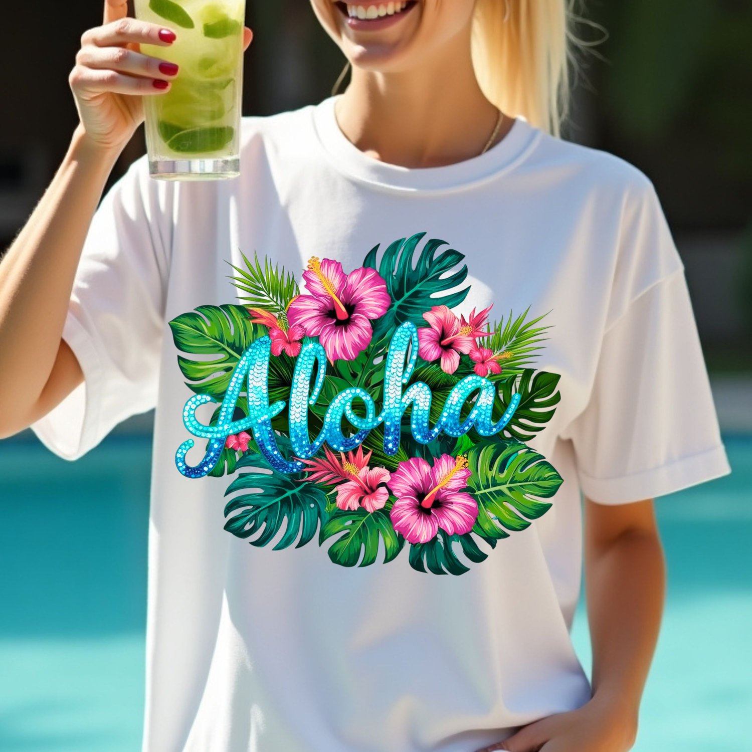 Aloha PNG Summer Time PNG Faux Sequin Aloha Sublimation Shirt PNG Hibiscus Tropical Beach Aloha Vibrant Floral Sequin Beach Shirt