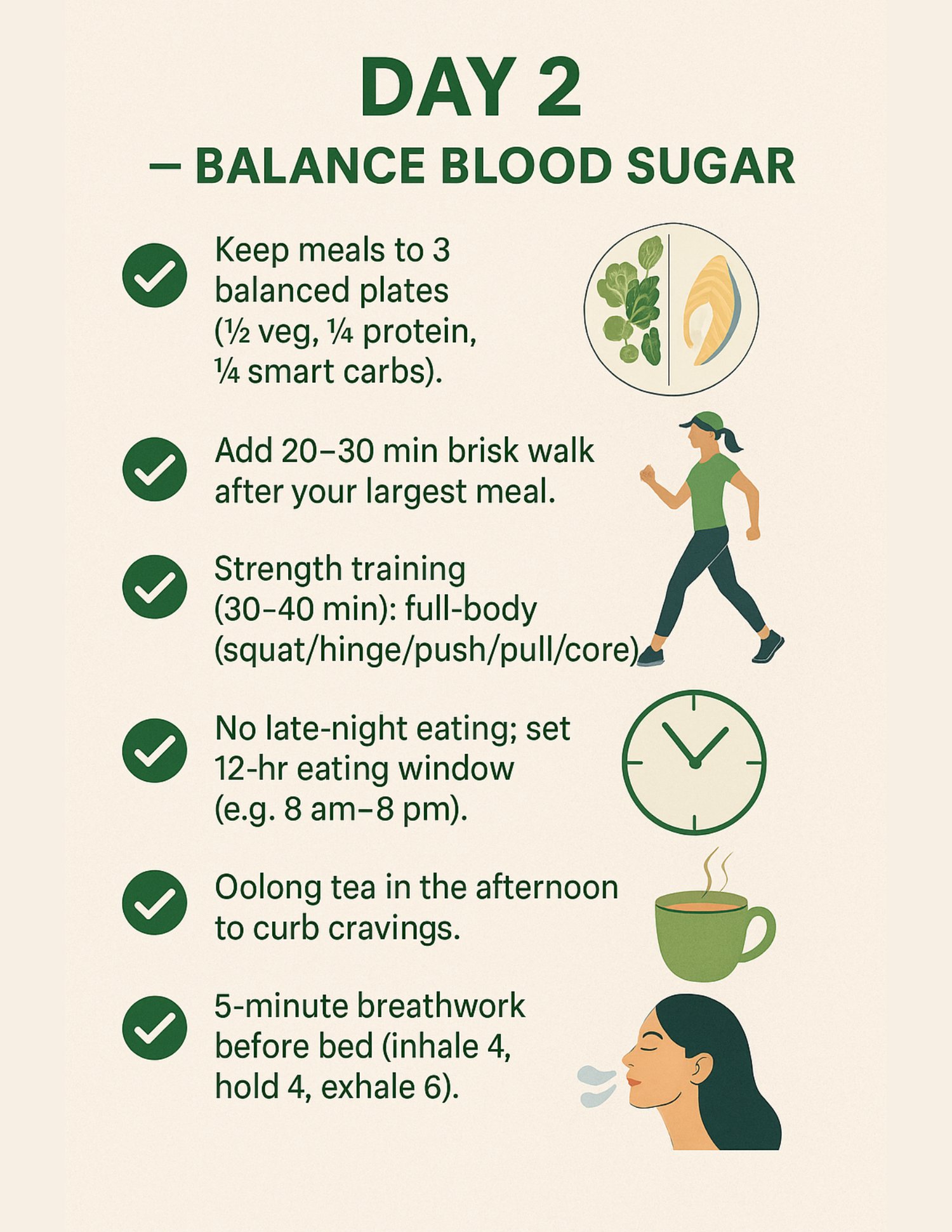 Reset your body and routine with this easy, visual 7-Day Wellness Plan designed for women who thrive on simple, illustrated guidance. Each of the 22 pages is an infographic you can print, display, or use digitally for quick daily motivation.