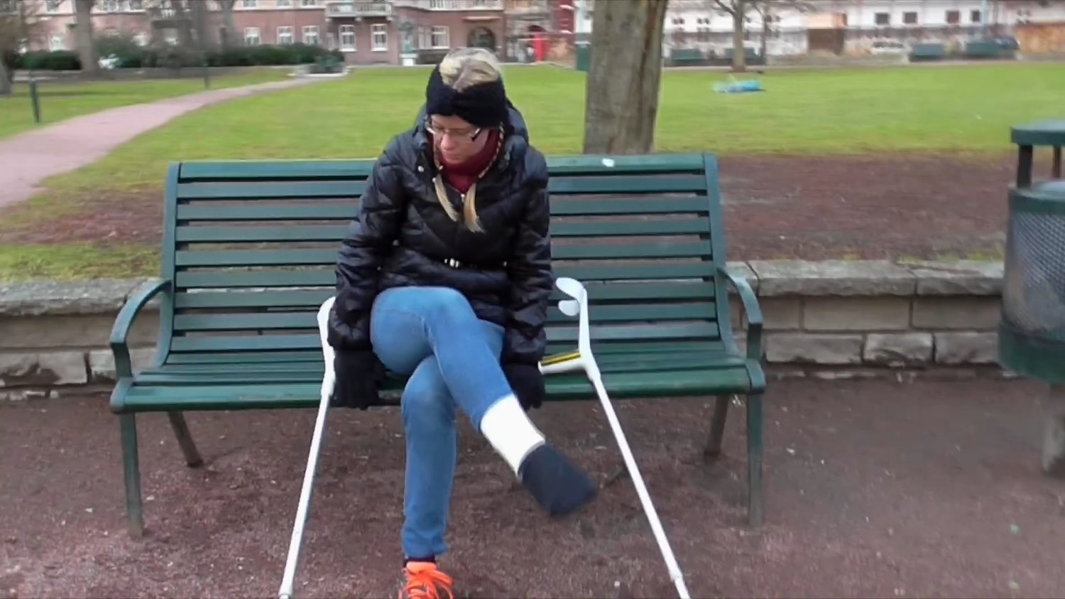 Sarah has a black sock over her white medical SLC when she crutch over a busy street and in to a park.She sits down on a bench to rest before she start crutching out from the park again.