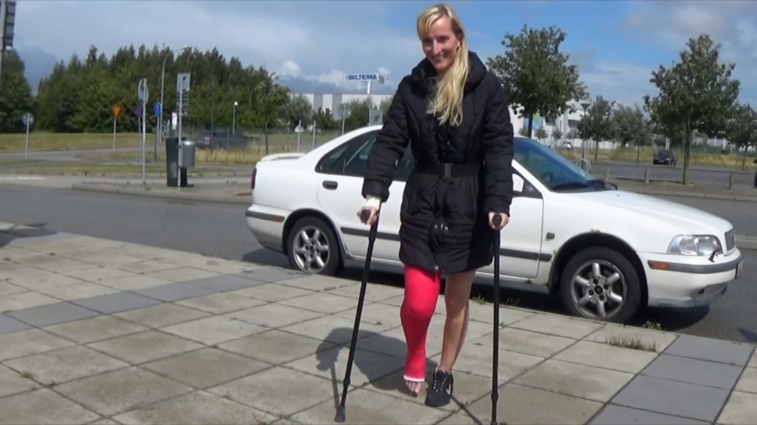 Stefanie has a LLC for the first time and before she wants to walk around crowded places, she wants to feel what it's like to crutch with an LLC.We see her therefore now crutch back and forth on a bridge over the highway to feel what it's like.Afterwards, she feels satisfied and starts posing by hanging her LLC on one crutch so we can get a great look at her and her cast.
