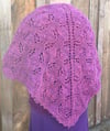 The lace pattern for Intriguing was designed specifically for this shawl and was named “gaslight lace” by sleepydaisy following a competition in my group, capturing both the fire and mystery of the design. It also features a custom-designed variation on a traditional picot bind off to complement the lace. It is constructed top-down with a traditional triangle shape.