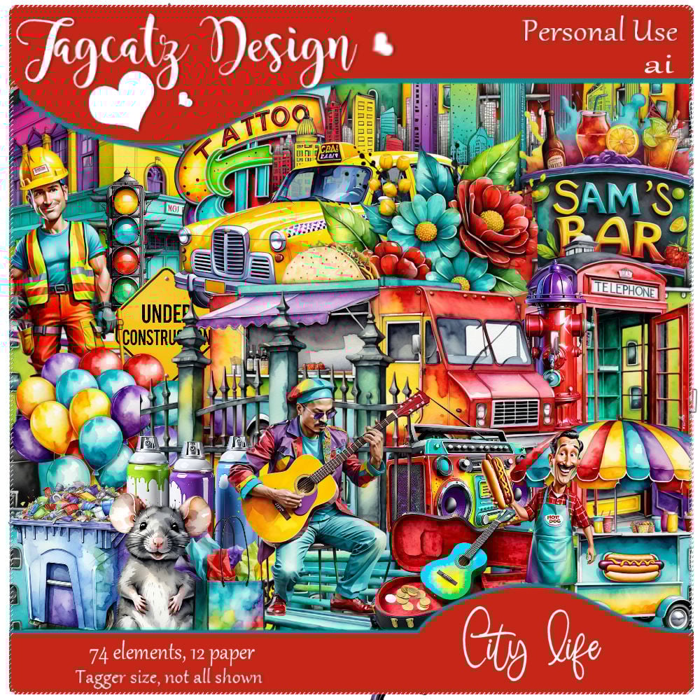 Everything you'd expect downtown in a big city! 74 elements and 12 papers. AI product. Tagger size. Not all shown. Personal use only.
