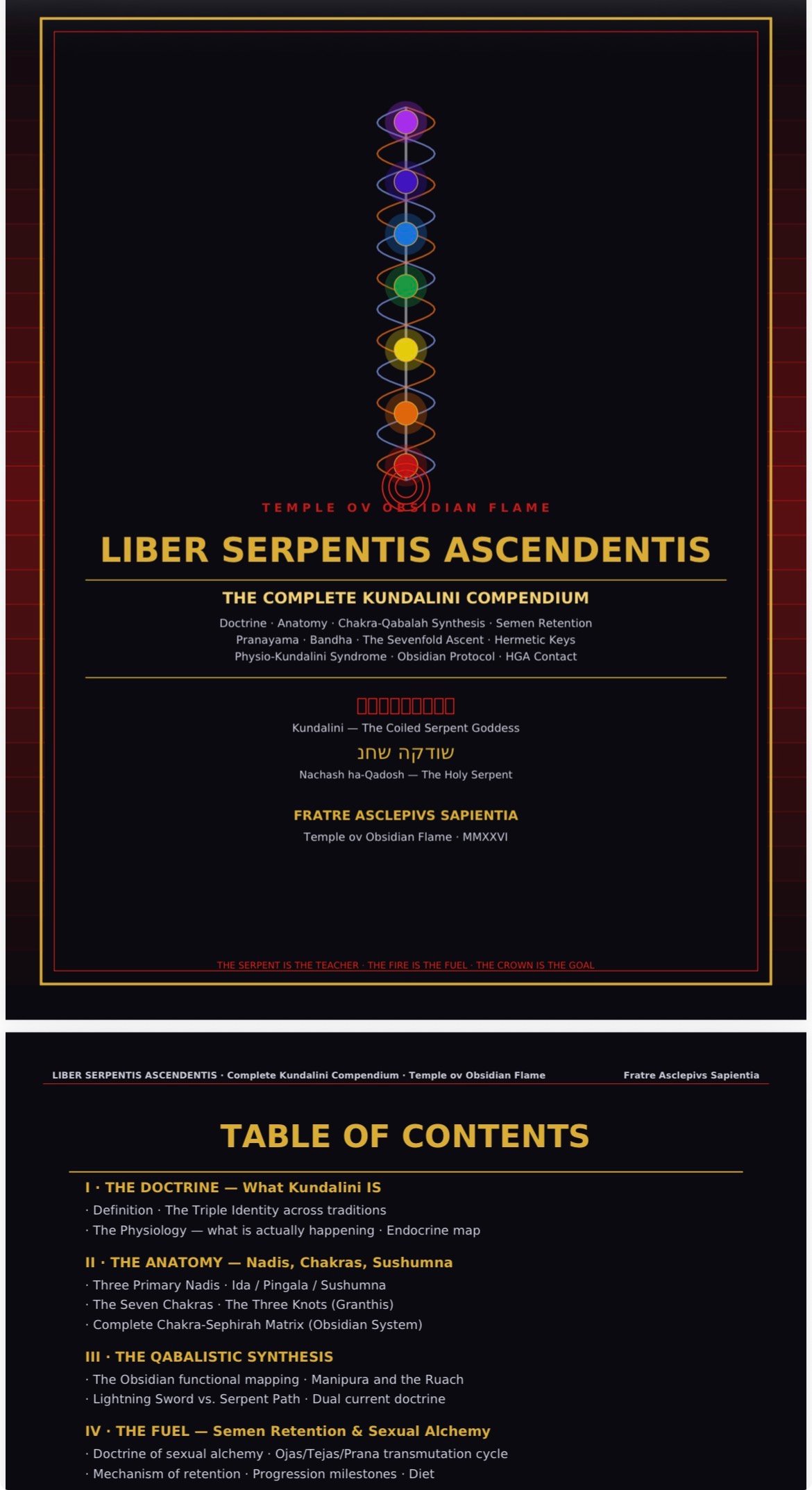 Part I — The Doctrine — What Kundalini actually IS across six traditions, the Triple Identity table (Tantra/Chinese/Alchemy/Qabalah/Hermeticism/Thelema), the full physiological mechanism (Vagus Nerve/Chyle/CSF axis), complete endocrine map (gonads → adrenals → thymus → thyroid → pituitary → pineal = Malkuth to Kether)