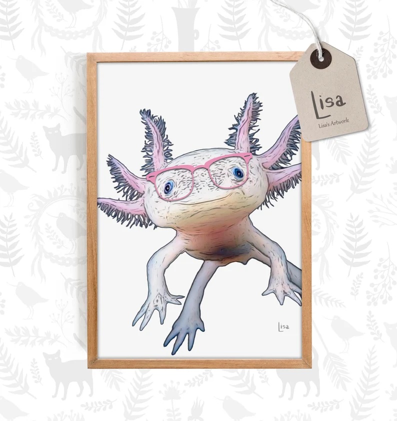 Axolotl salamander animal with glasses, cute axolotl, axolotl art, printable wall art, animal print