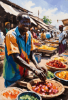 Rendered in a painterly style, “Heartbeat of the Market” has the aesthetic resembling Impressionism. Notice that the products they were selling were hard to read, that is because it was intentionally made to be minimal, looking only at the bigger picture, which is one of the essence of an Impressionistic Art. Despite the glaring harsh sunlight covering the entire scene, the smile of every vendors shine through. Regardless of its bright imagery, the infectious optimism painted on each people’s faces makes it a very positive piece.
