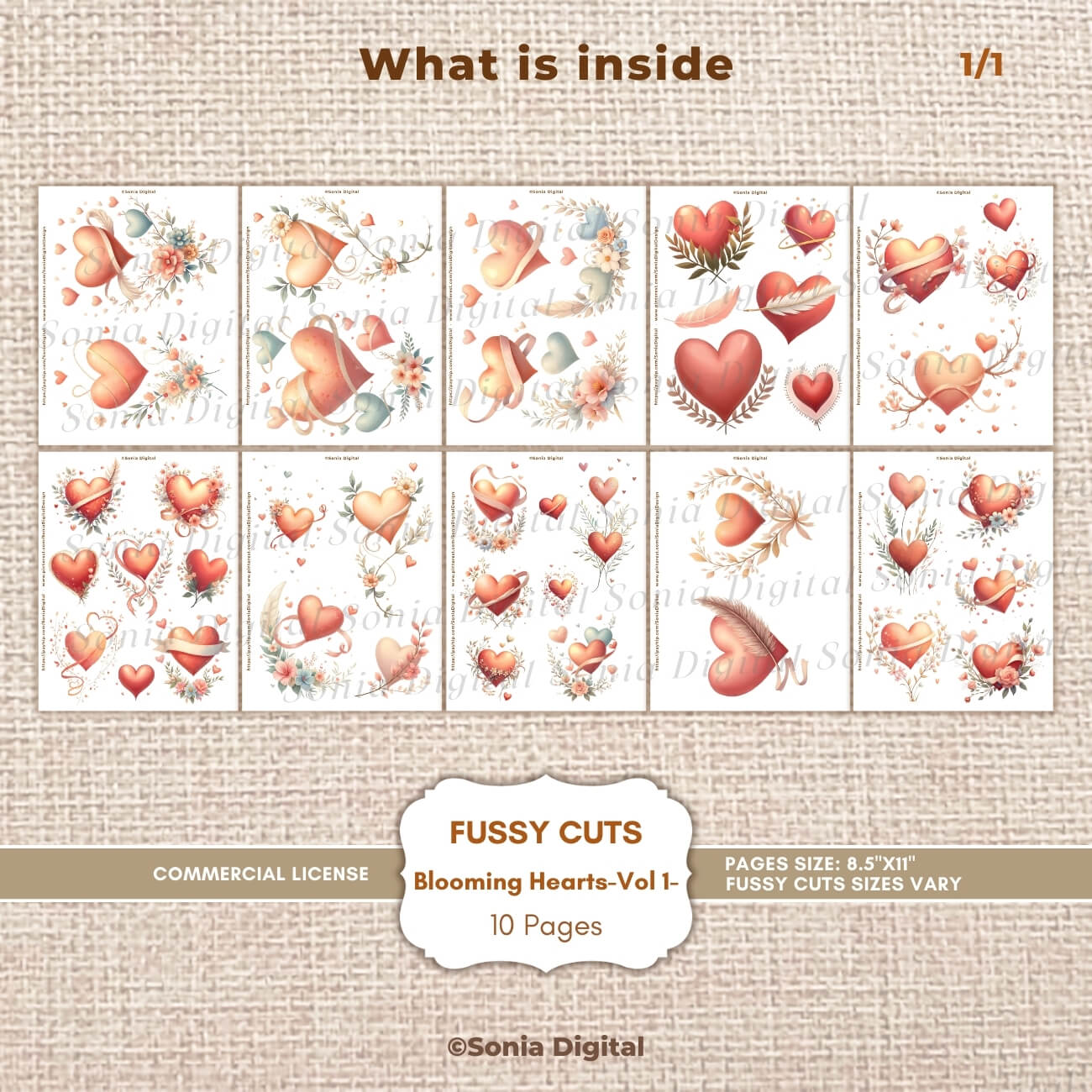🔸10 printable Fussy Cuts pages, “Blooming Hearts” Collection (Vol 1). In Letter size 8.5”x11”. All pages are sold watermark-free. Fussy Cuts Sizes vary. Commercial use license included*.