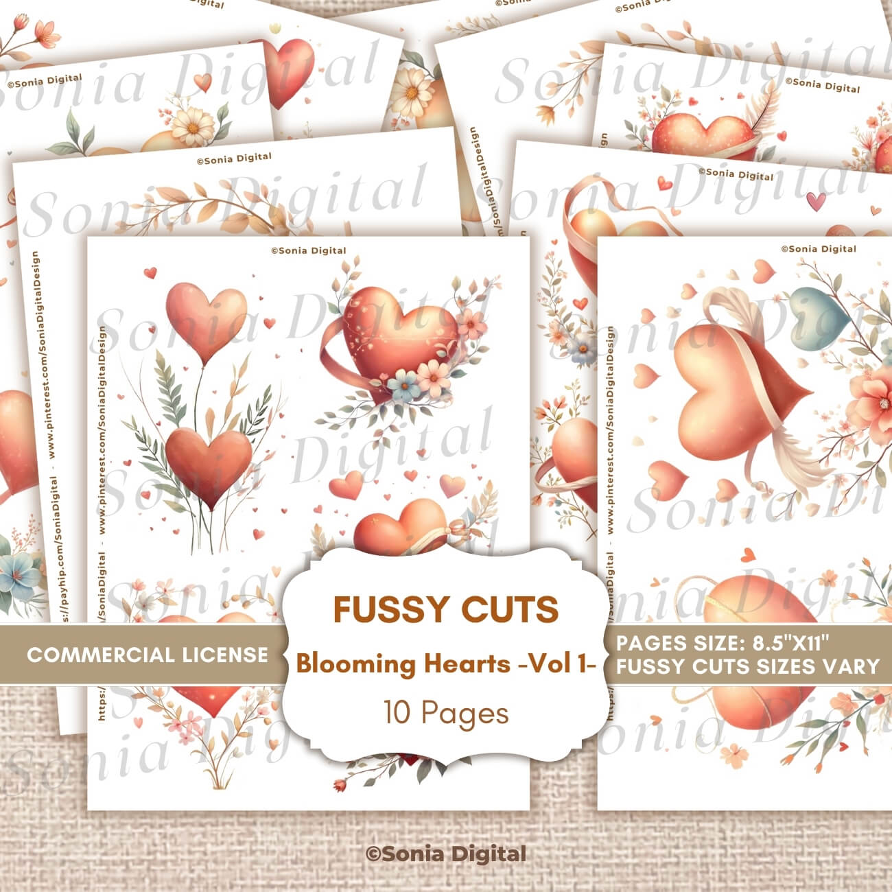 10 printable Fussy Cuts pages, “Blooming Hearts” Collection (Vol 1), for Scrapbooking and Junk Journal creations. Pages are Letter sized (8.5”x11”). Commercial use license included*.