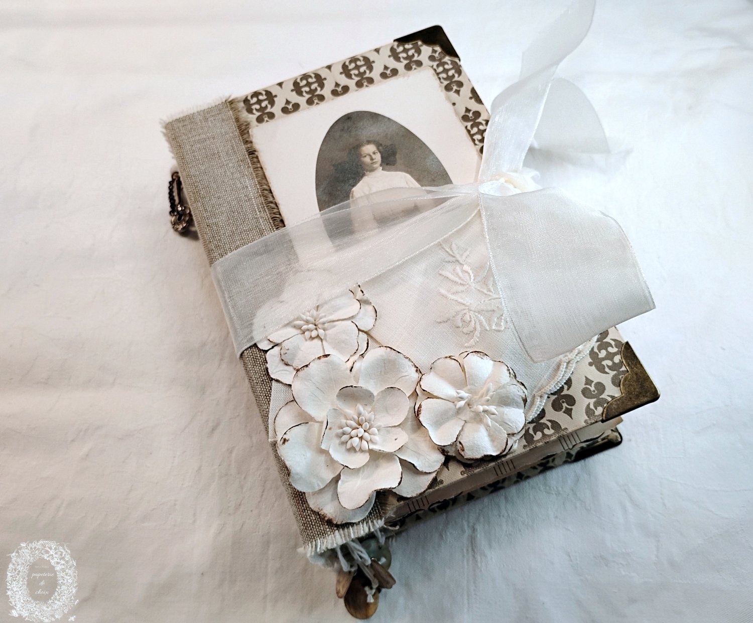 Big Bow Girl is a journal made from a vintage book with the original cover that has 152 writing pages, 4 tags, 41 pockets/tucks, 32 journaling cards, 4 special ephemera, 5 signatures, measures 7.75 inches tall x 5.25 inches wide x 2.25 inches thick, and features an authentic antique photo postcard inside a pocket made from a vintage handkerchief on the cover.