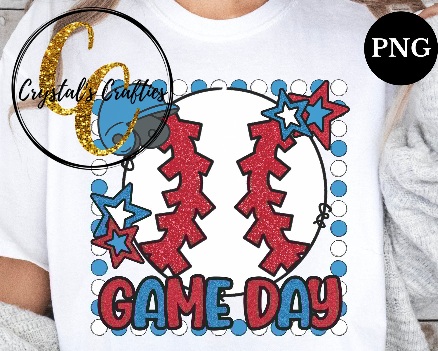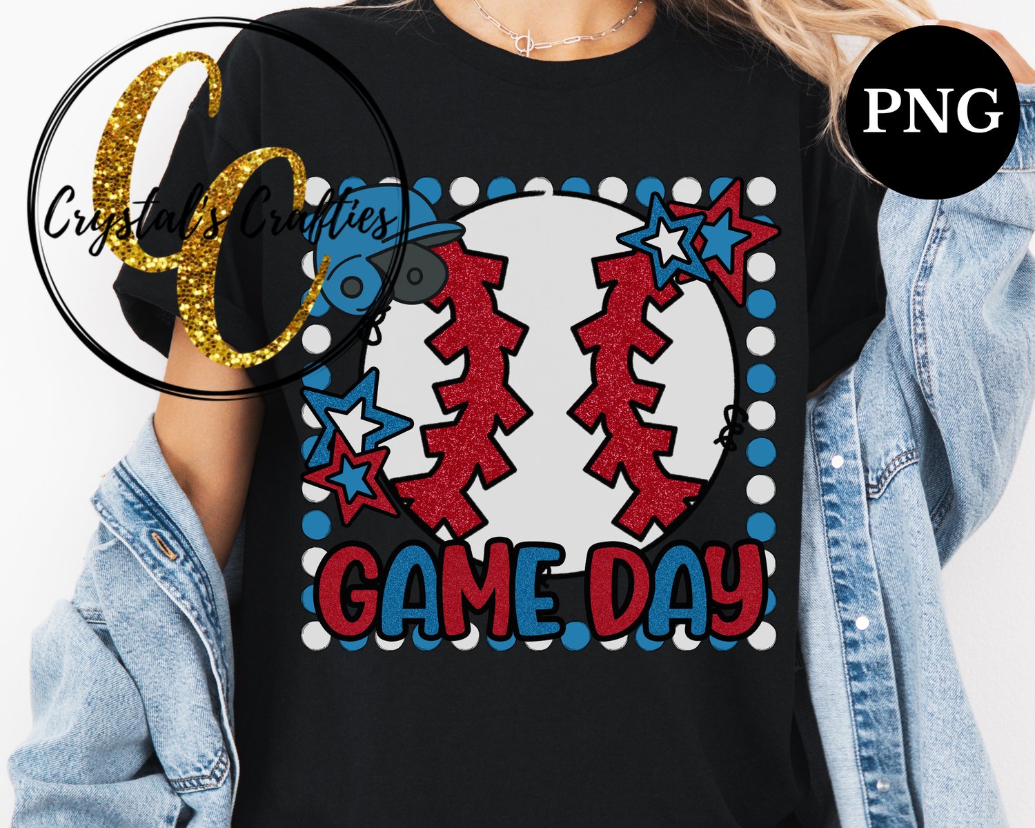 Show your team spirit in style with this Baseball Game Day PNG featuring a fun boutique-style design perfect for baseball moms, fans, and game day outfits! This design includes a bold “Game Day” phrase, a large glitter baseball, sparkling glitter stars, and a playful dot border that gives the whole graphic a trendy boutique feel.