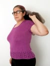 A feminine but linear tee with a slight negative ease, Malvarosa relies on the softness and drape of Malabar’s blend of cotton and silk to create a form-fitting garment that will settle on your shapes. The slight waist shaping, worked only on the back, and the variable breast shaping (you can choose between three options) will create the best fit for you.
