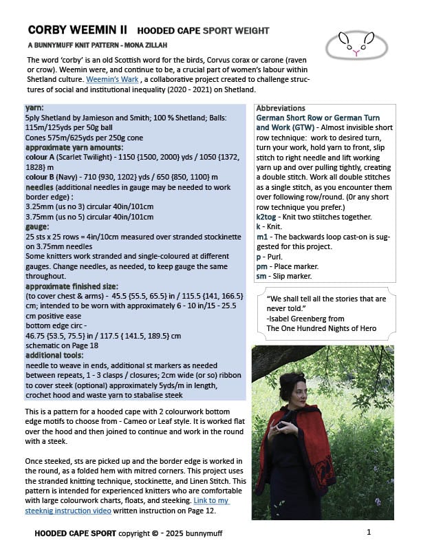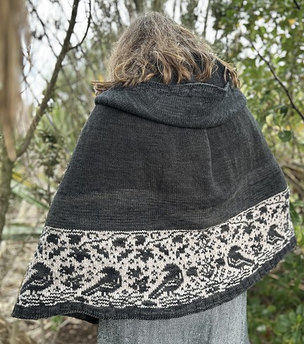 This is a pattern for a hooded cape with 2 colourwork bottom edge motifs to choose from - Cameo or Leaf style. It is worked flat over the hood and then joined to continue and work in the round with a steek.