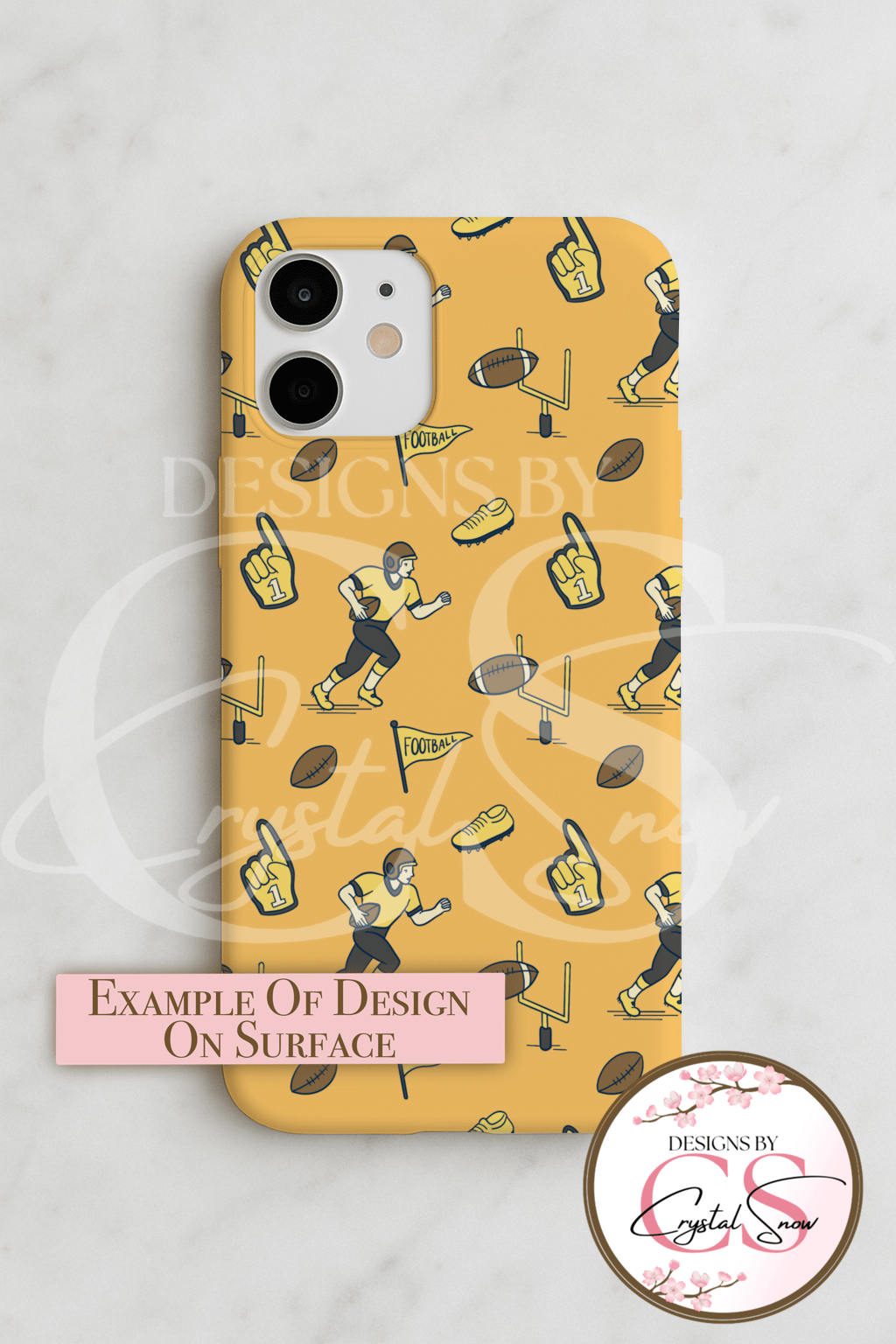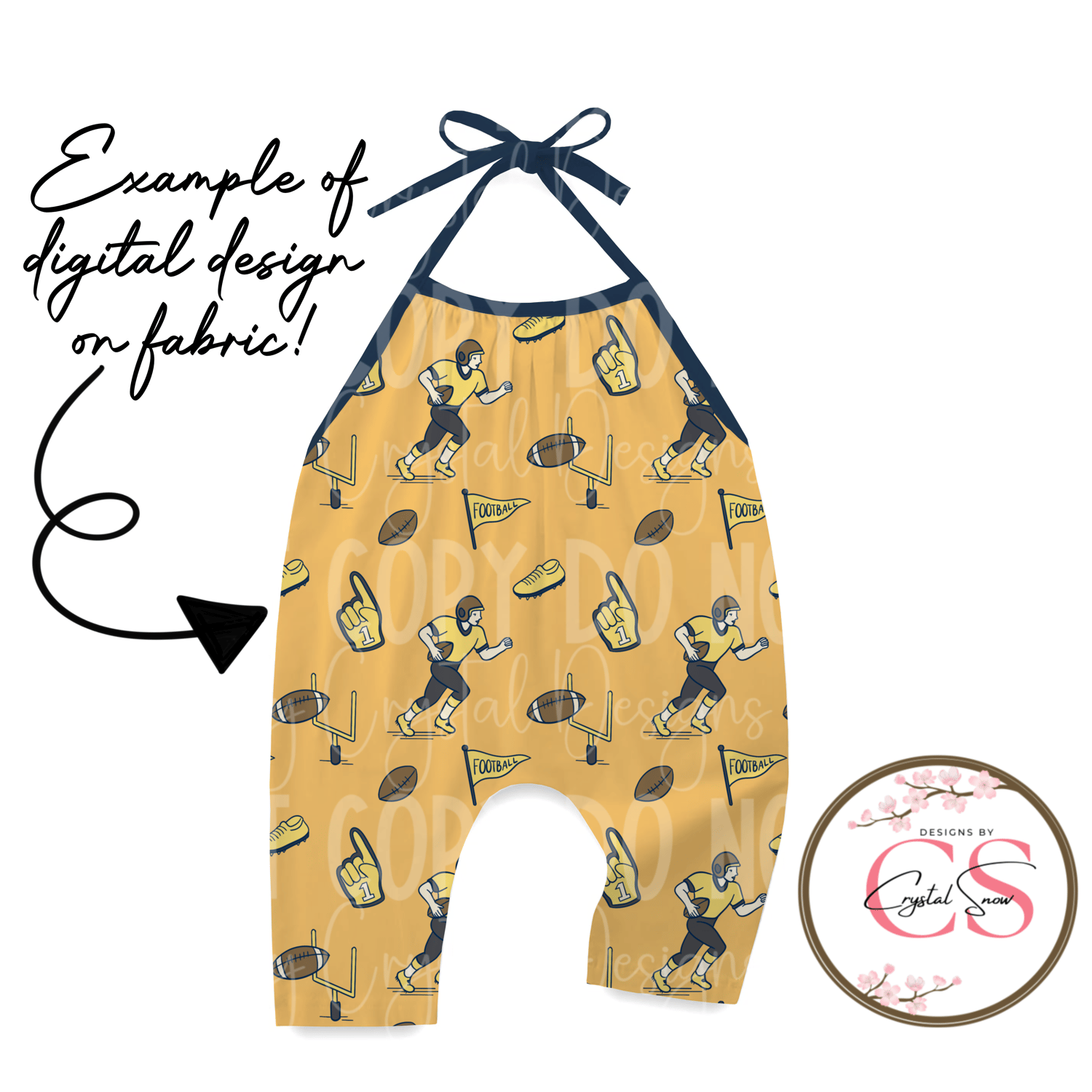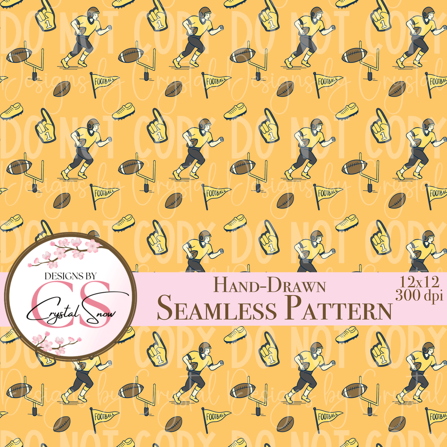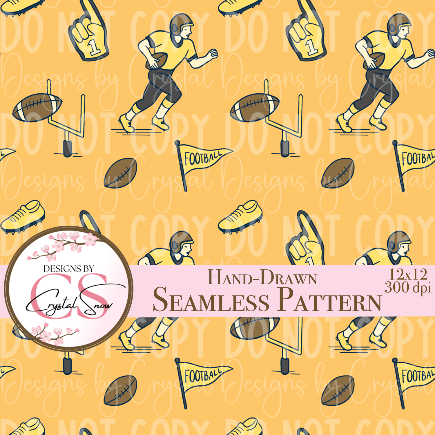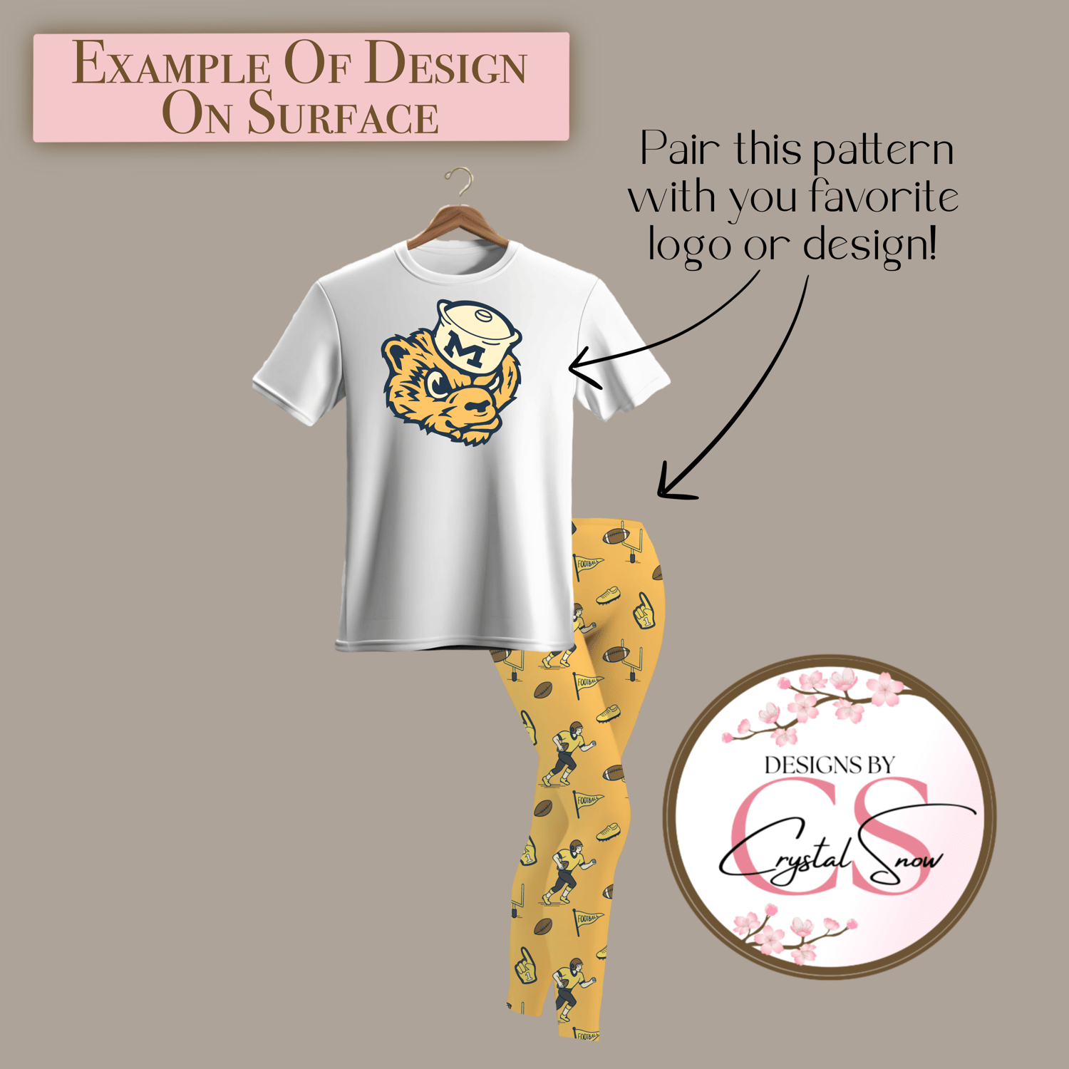 This hand-drawn seamless pattern is packed with all the game day vibes—players, goalposts, foam fingers, footballs, and flags—all set against a bold vintage maize background. Whether you’re making leggings, t-shirts, mugs, or scrapbooking pages, this design brings team pride and sporty style to any creation.