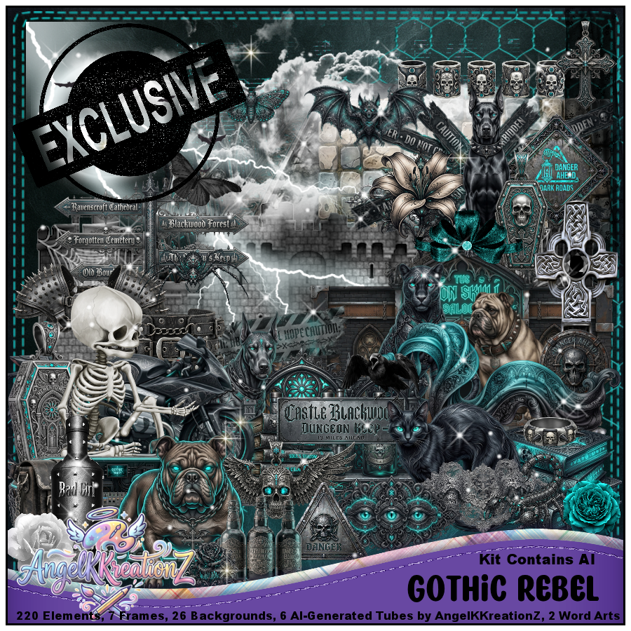 🖤Step into a world where dark elegance meets rebellious spirit. Gothic Rebel captures the raw beauty of gothic attitude—braided strength, metallic edge, tattooed stories, and shadowed emotion. Inspired by leather textures, silver chains, skull accents, and moody grayscale tones with a striking pop of teal, this kit is perfect for bold layouts, alternative designs, and edgy storytelling.