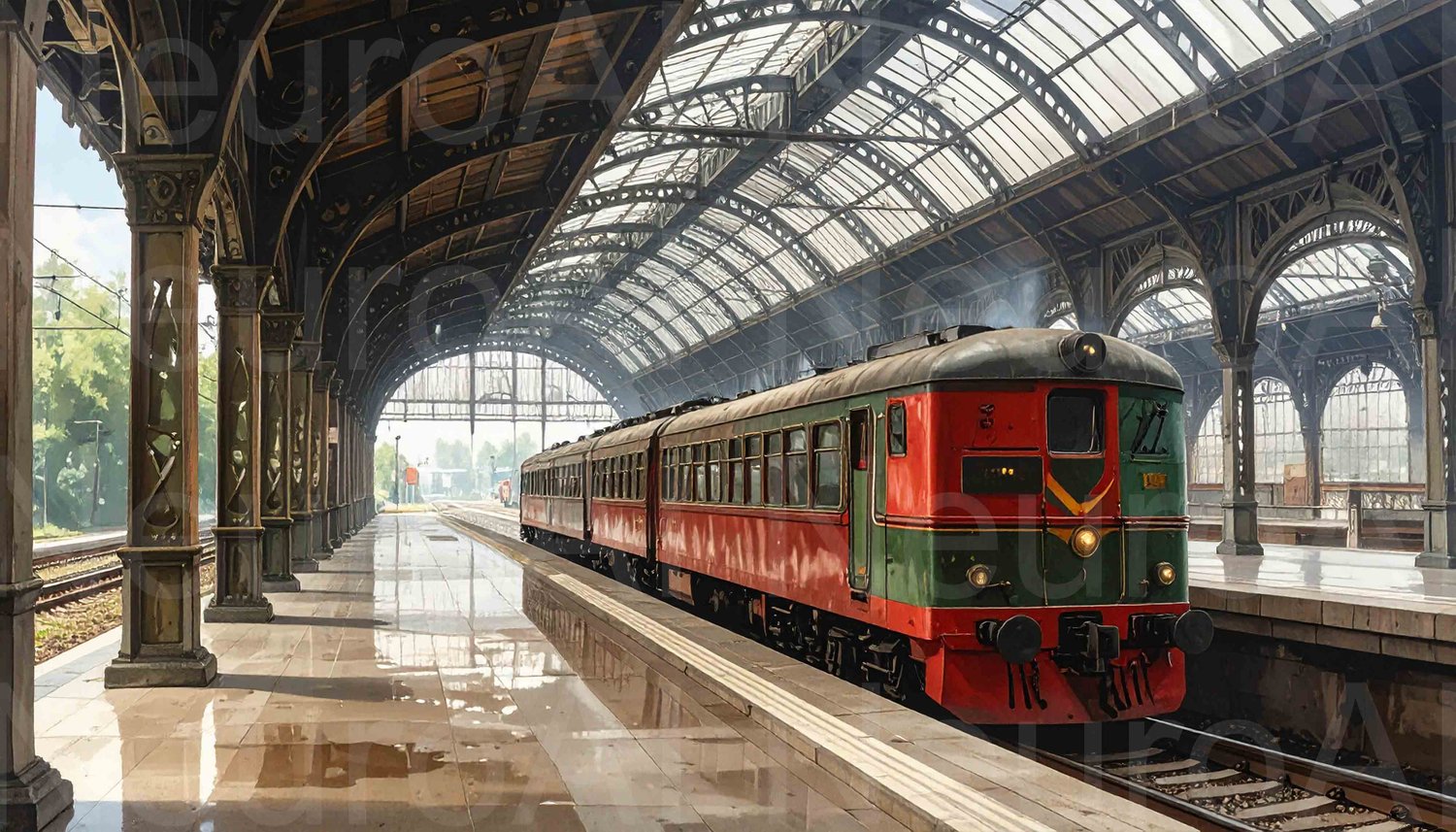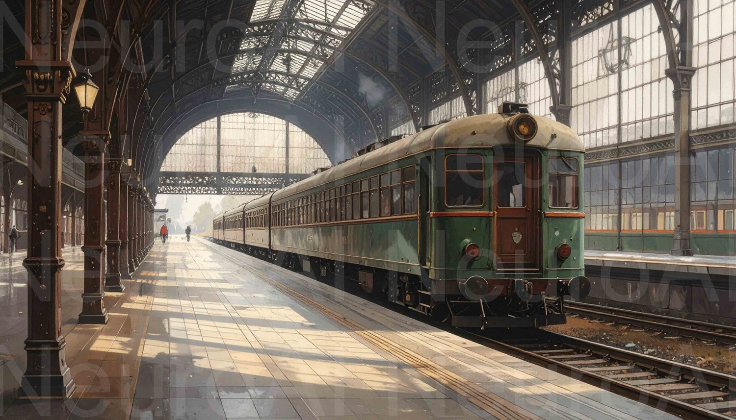 Vintage train awaits passengers at grand station