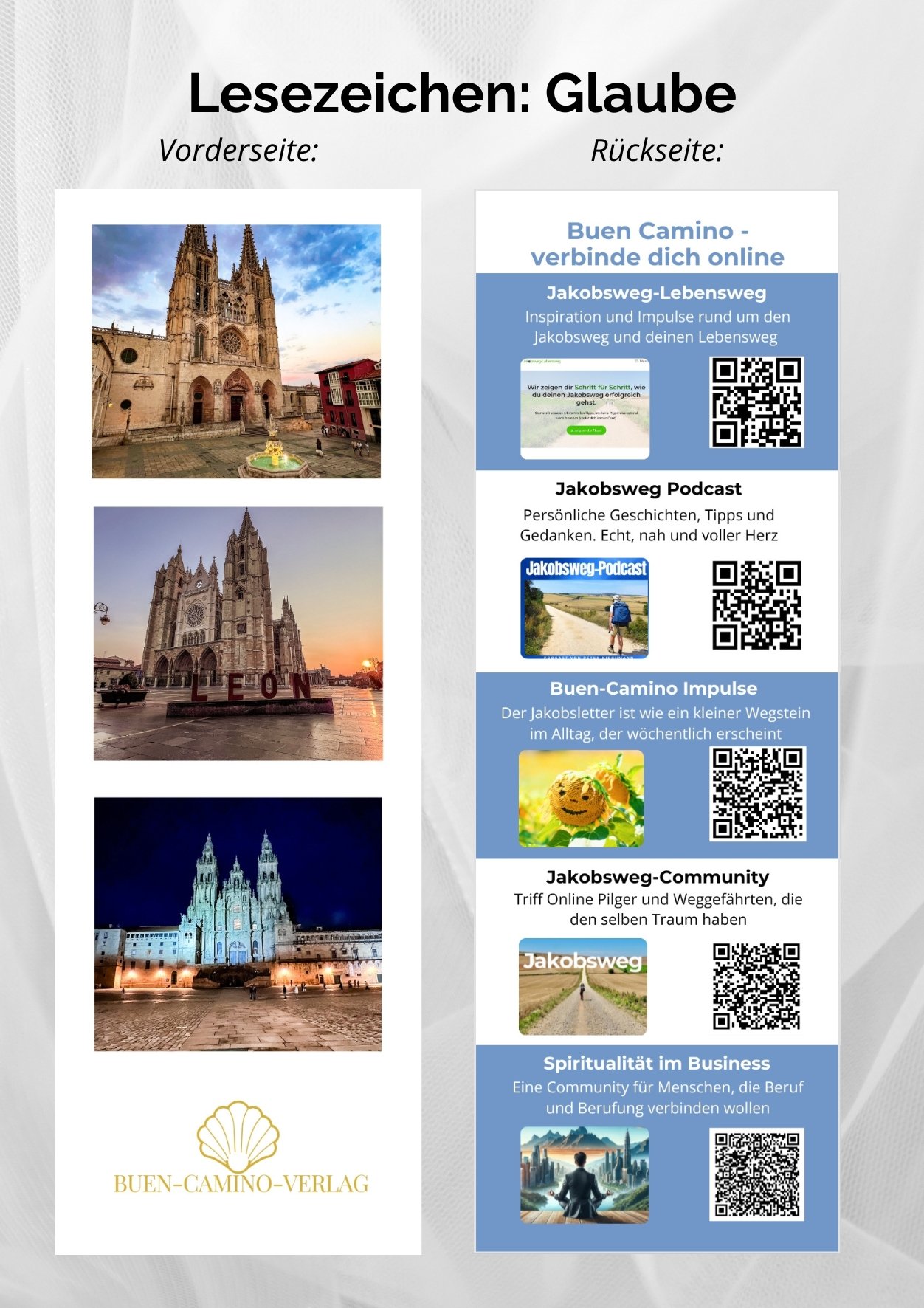 Die Rückseite verbindet dich direkt mit der Buen Camino Welt – mit Podcast, Impulsen, der Jakobsweg-Community und Inspirationen für deinen Lebensweg.