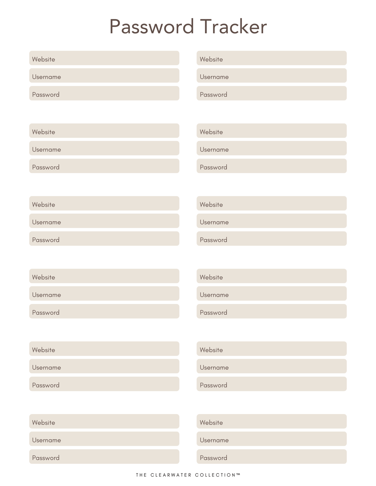 Are you tired of scrambling to find your passwords whenever you need them? The Clearwater Collection™ Printable Password Tracker is the perfect solution for keeping your home or business accounts organized and easily accessible.