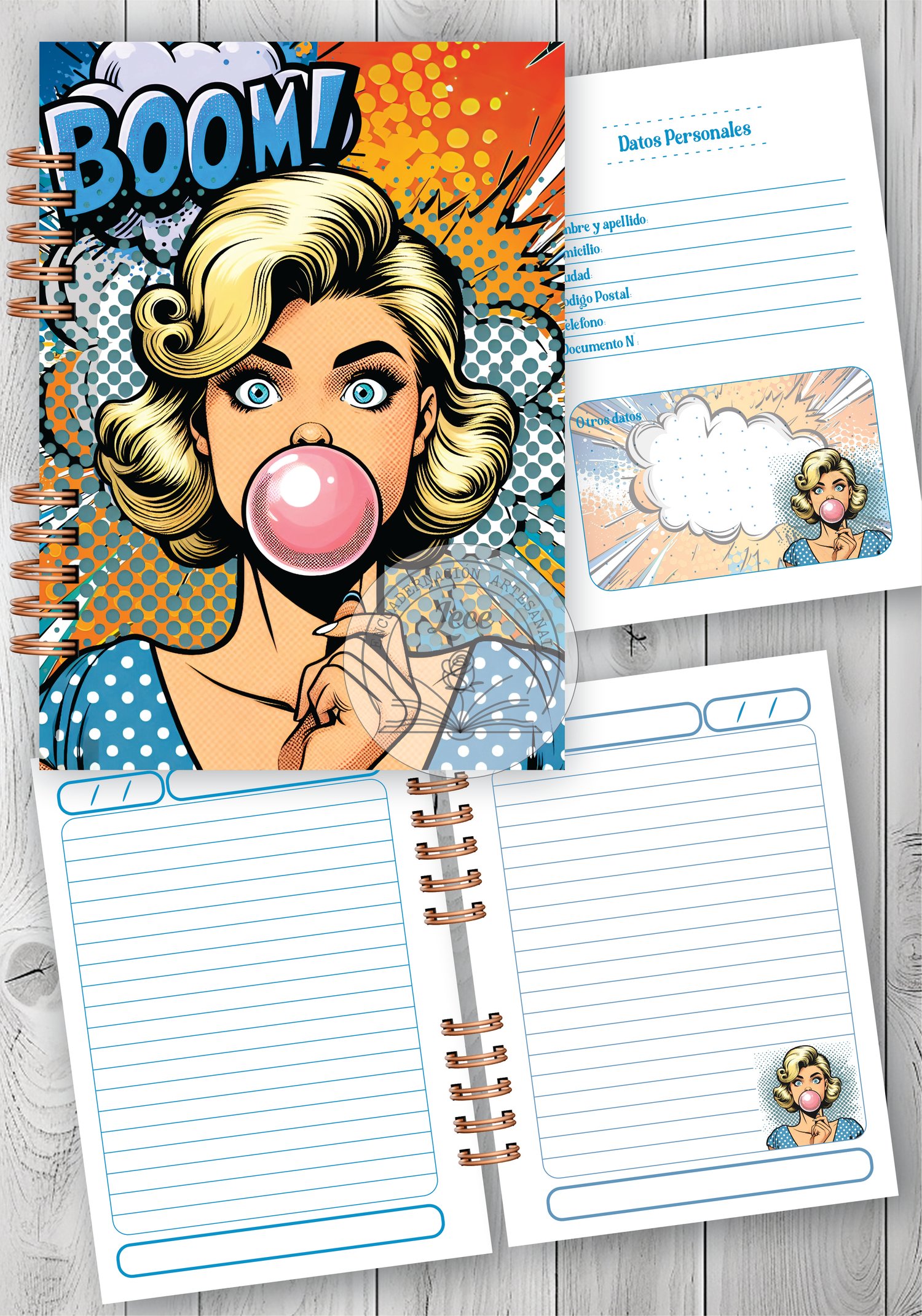 - 4 modelos de interior de 100 hojas rayadas (incluye nota de datos) a tono con las portadas con sus variantes para imprimir en tamaño A5 para anillado y costura