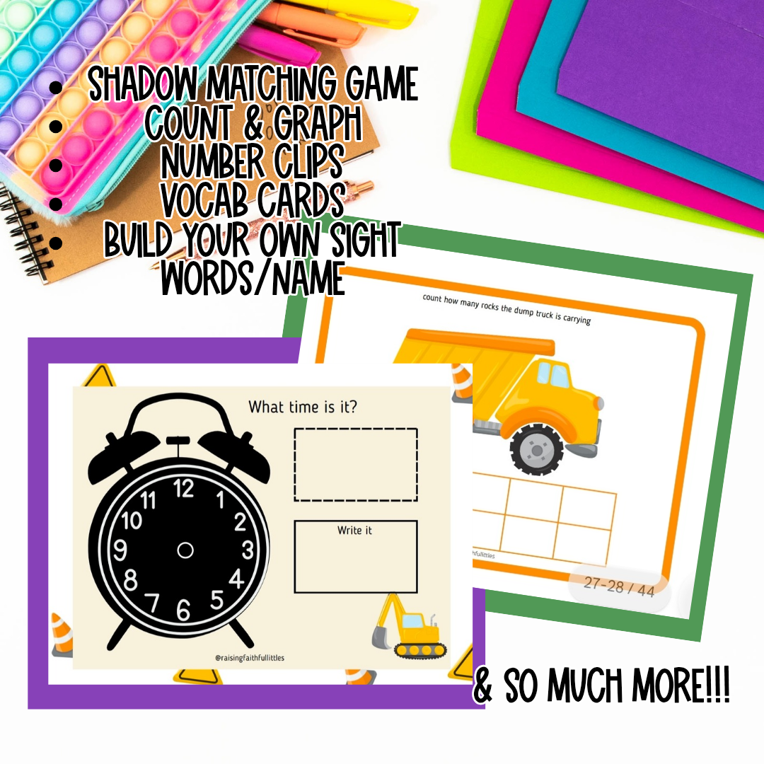 Construction site busy book is the perfect quiet time activity for small kinder gardeners and 1st graders . Use this activities to increase interaction with children in homeschool learning environment or in the go.