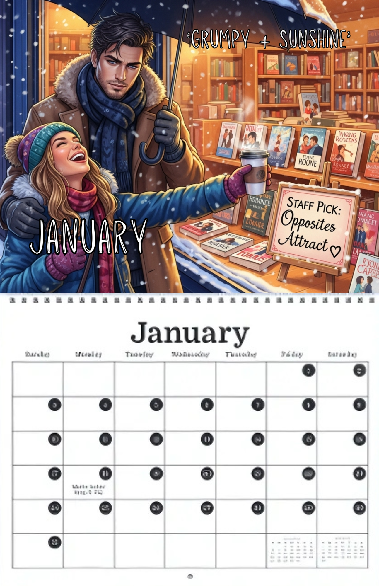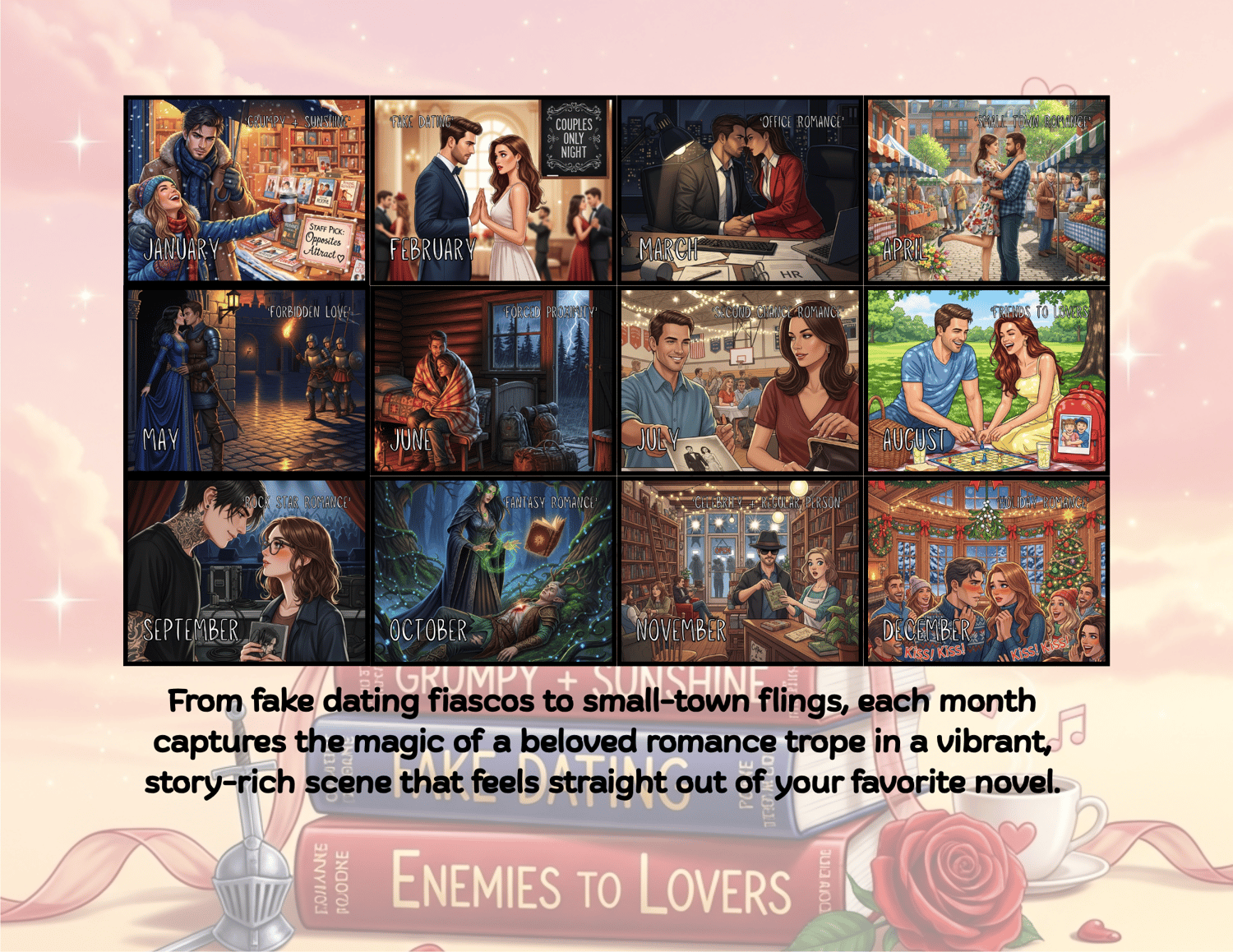 Fall in love every single month with this beautifully illustrated Romance Tropes Calendar, designed for hopeless romantics and book lovers alike. From fake dating fiascos to small-town flings, each month captures the magic of a beloved romance trope in a vibrant, story-rich scene that feels straight out of your favorite novel.