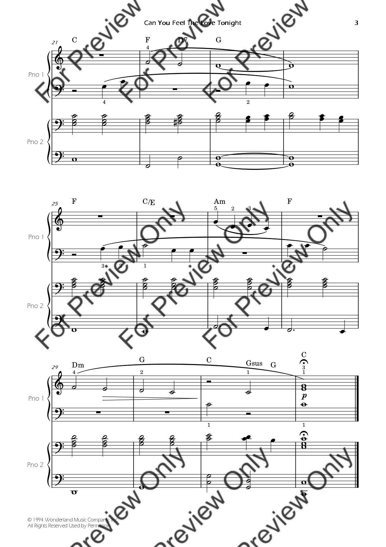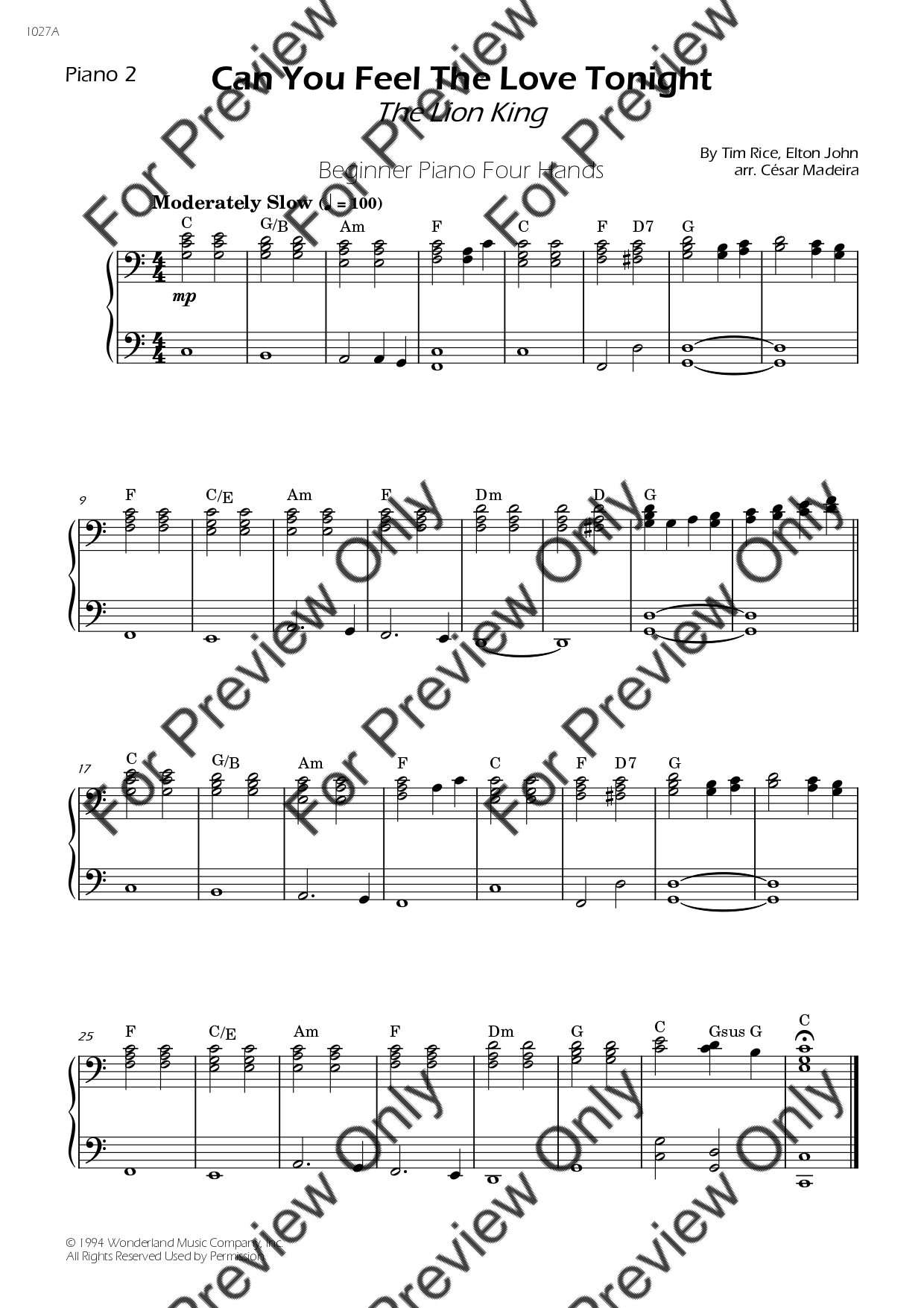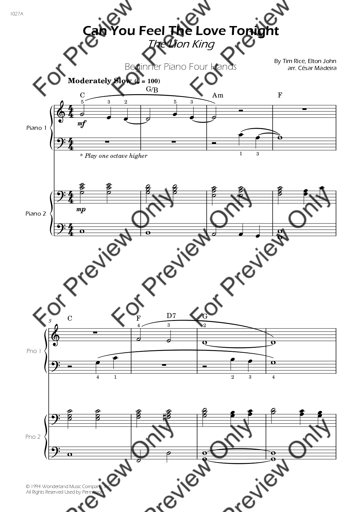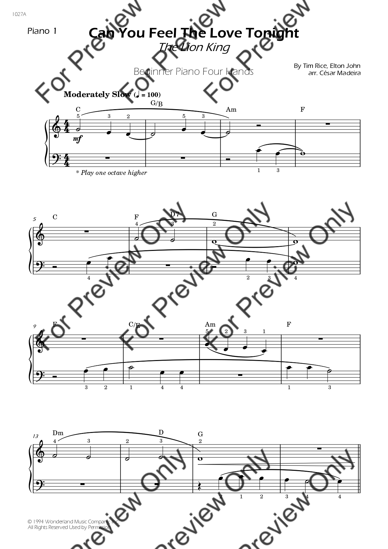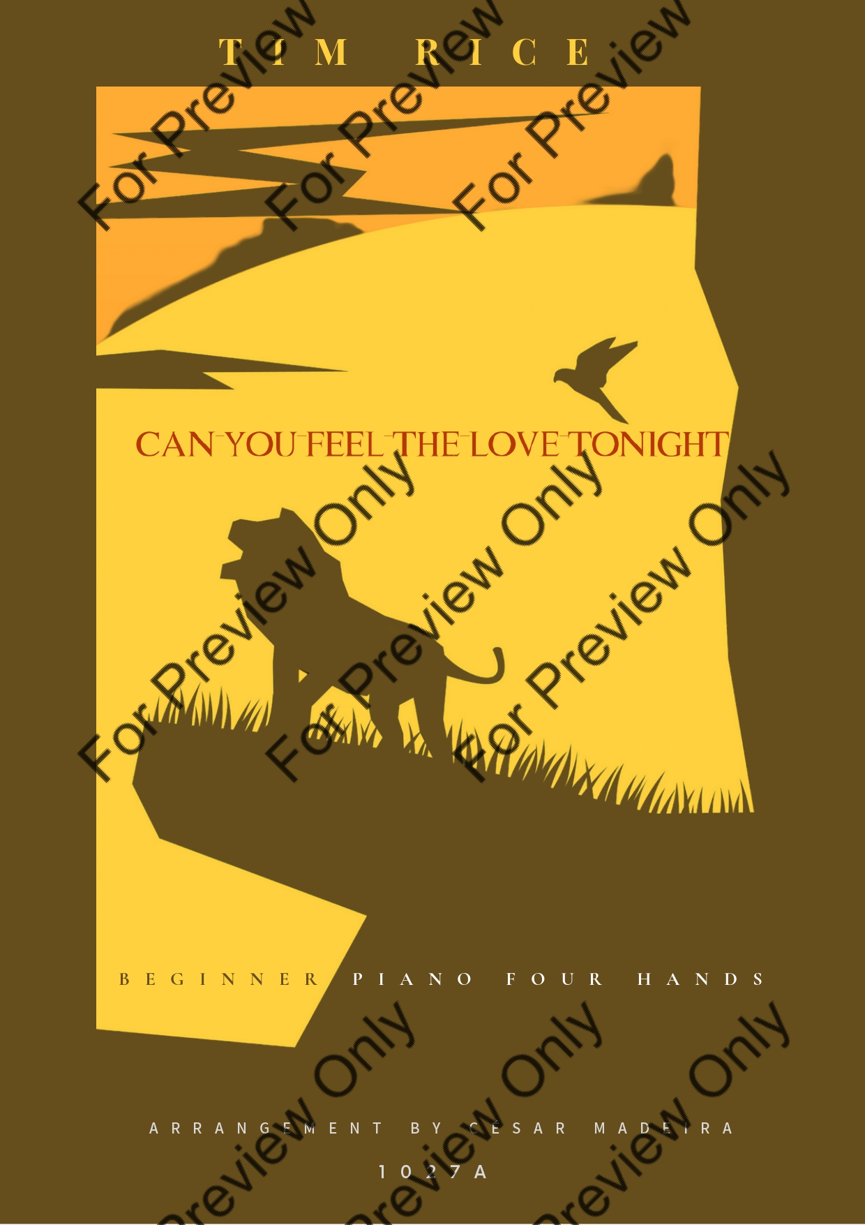 Can You Feel The Love Tonight from The Lion King by Tim Rice. Arrangement for Beginner/Easy Piano Four Hands. With Full Score and Individual Parts. Have fun!
