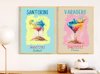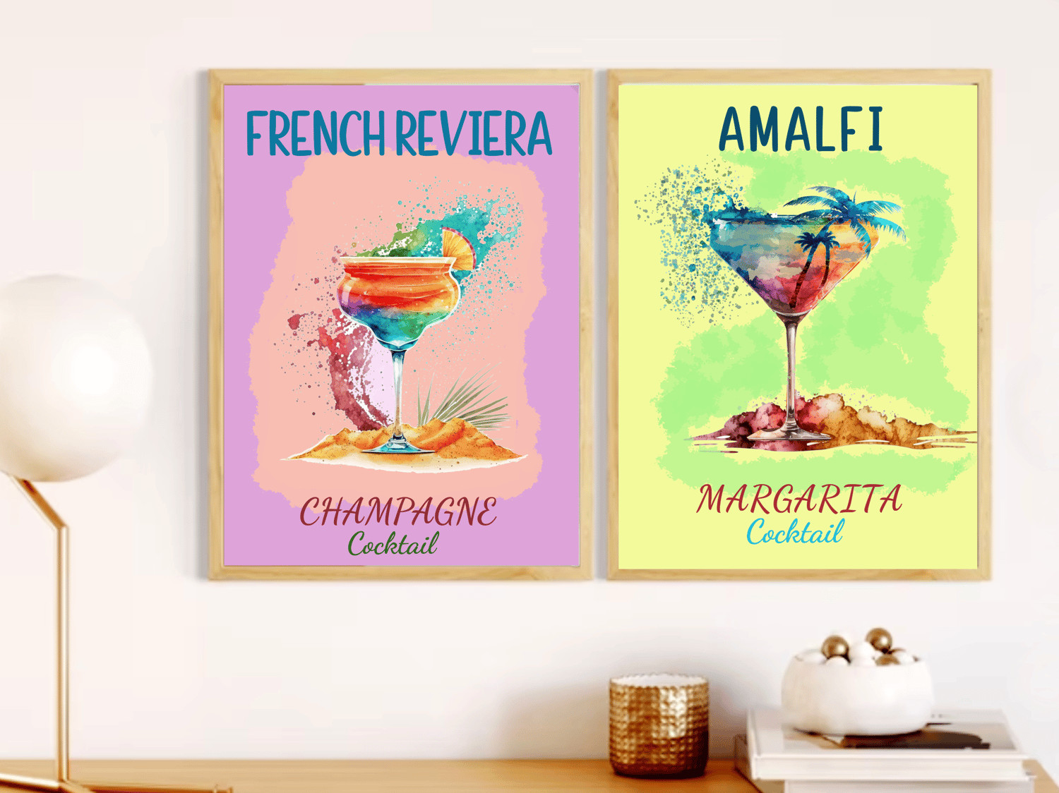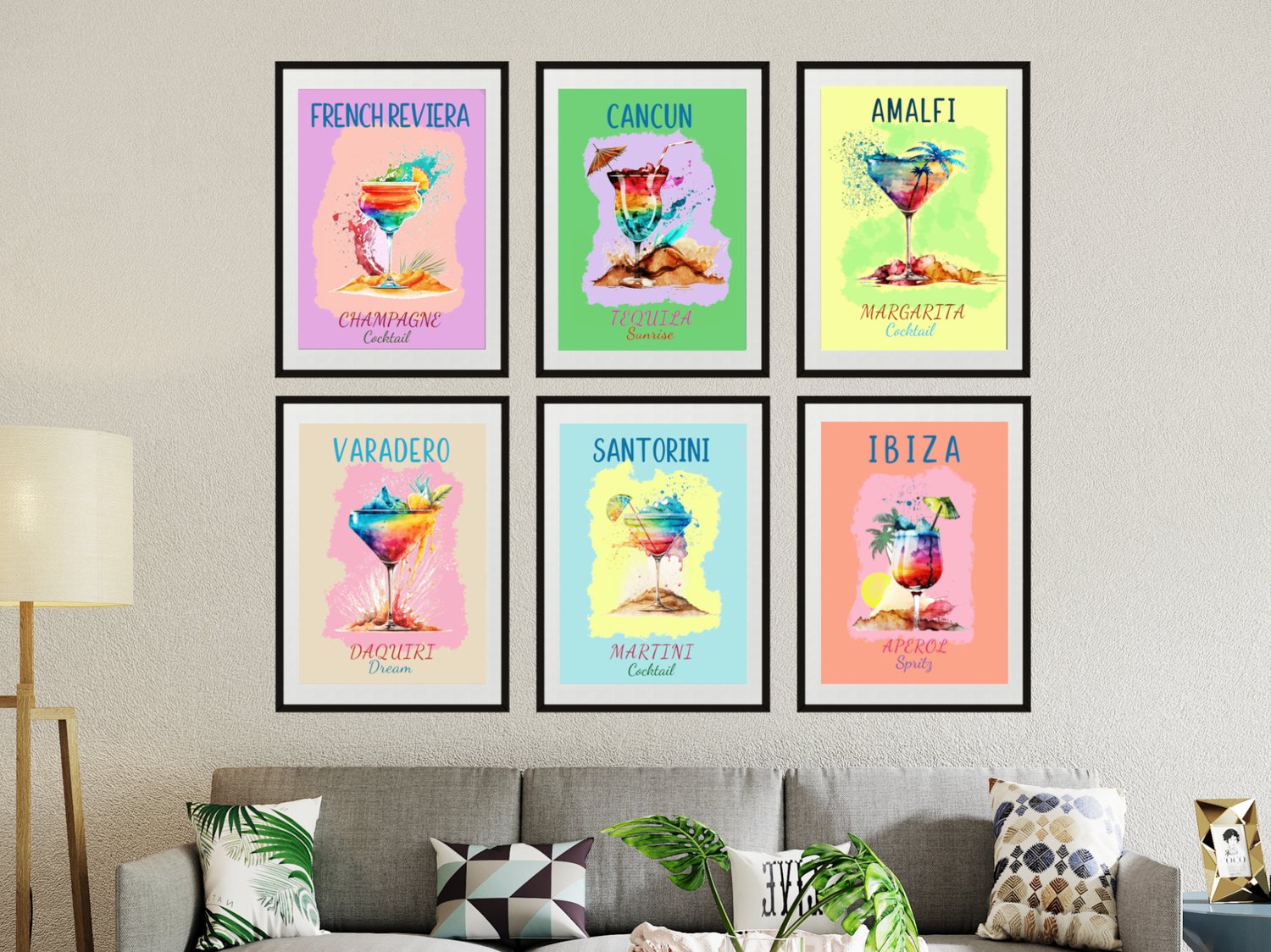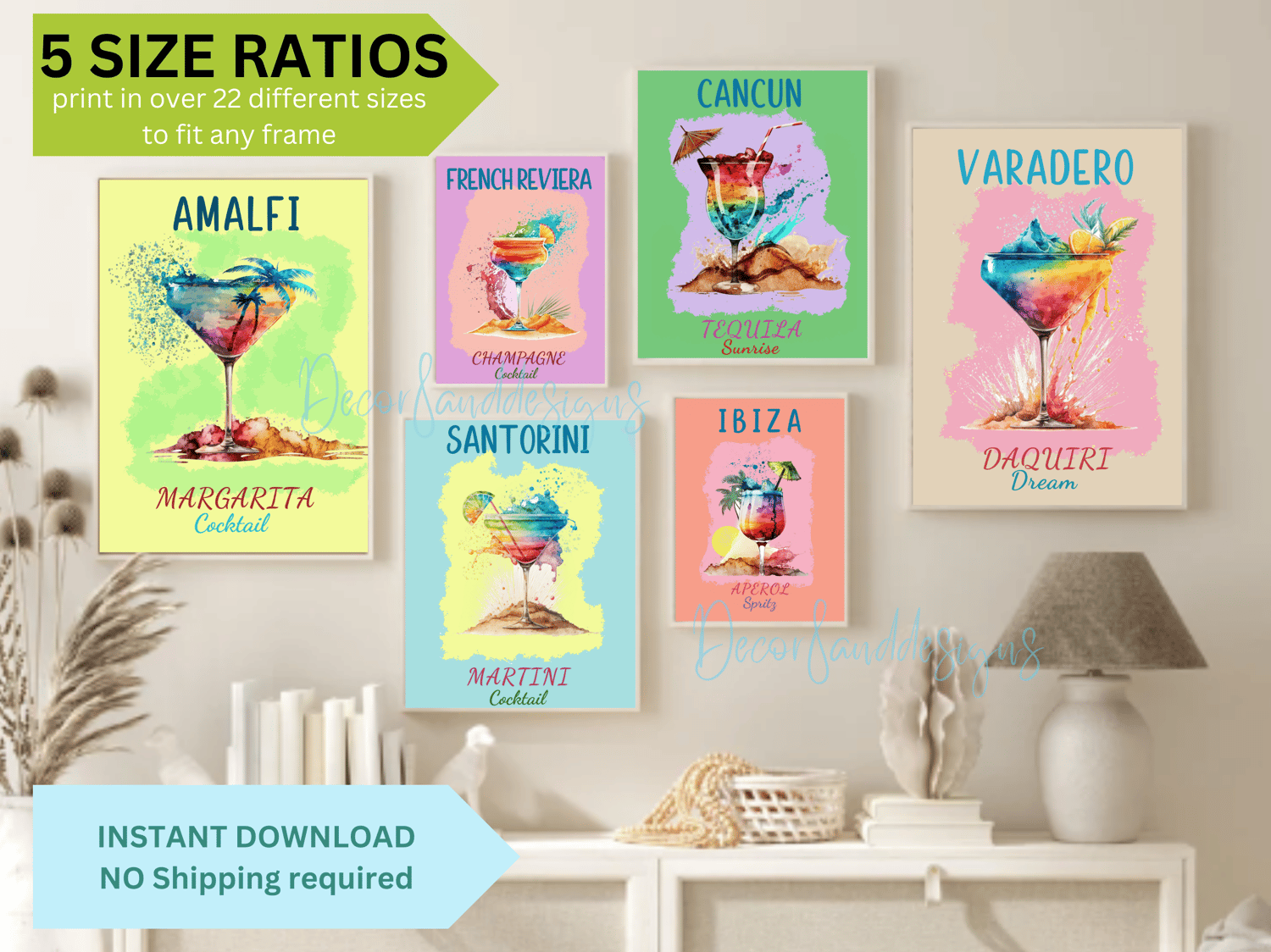 A colorful unique and exotic cocktail print Set of 6 instant download bar cart style posters. Retro trendy bar cart wall gallery bundle. These printable wall art prints feature popular tropical, exotic beach locations where you'd enjoy a happy hour cocktail or two under the setting sun. Uniquely designed in watercolor abstract and dreamy overlays giving your walls a burst of color and instant attraction from visitors. Allow your walls to tell a beautiful colorful story! Get visitors talking.