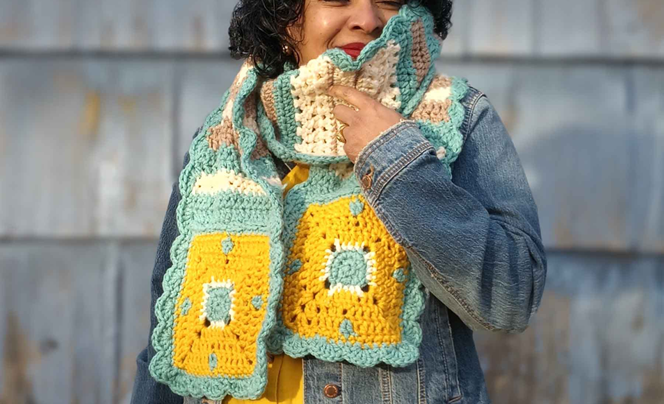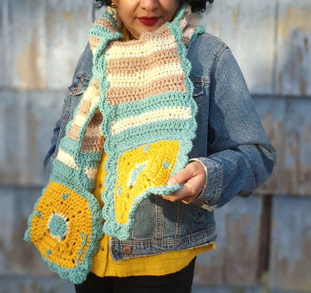 The best part? It’s beginner-friendly yet engaging, with a mix of stripes, granny squares, and scalloped edges to keep things interesting.