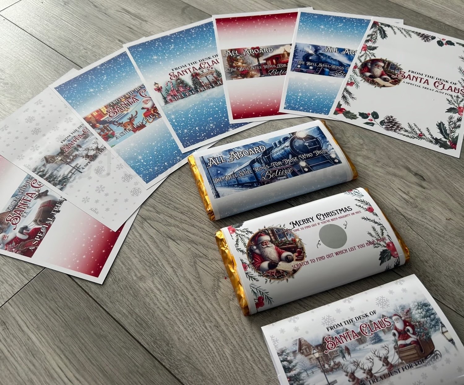 Christmas chocolate sleeves. Sleeve is A5 in size. Simply wrap around a 110g-135g Galaxy bar and seal with double sided tape. 6 designs available.